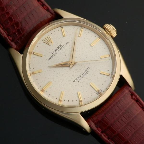 当然、ロレックスのサブの6538やトゥールビートなど、1030派生キャリも含め、数多くの伝説モデルのメインキャリとなるが、やはり6500番台、いわゆる6500ファミリーを語らずにオイスターパーペチュアルは語れないのではないだろうか。特にデイト6534,6535などシンプルが故に奥深い印象を与える。そのファミリーのノンデイトが6564であることは間違いない。1950年に誕生しダイアルに拘りを魅せ、クロワゾネダイアルなども存在したり、アワーズマーカーズとして★方のインデックスを起用したりと奇抜なデザインにコレクターも多い。今回の一品は後期のバーと3,6,9に配置されたソード型バーとのフライングアワーズマーカーで針はそれに同調するように夜光のアルファー針。更にケースはかなり淡く感じさせ品のある金無垢色の14金無垢シャンパンゴールド。ケースのインサイドの刻印の通り、共通パーツとして6500ファミリーの一つである”Ref.6565”の刻印まで存在する。6536など、又、6534,6535の1500同様に共有パーツに見られるロレックス独特の歴史をかいまみる最高の一品てあることは間違いない。