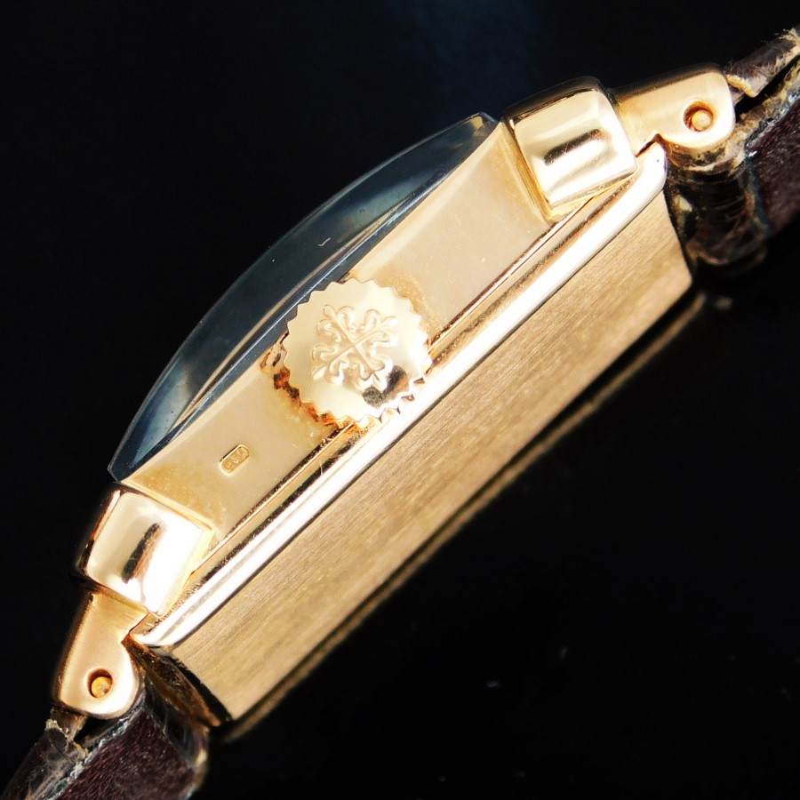 1934年に誕生し、テンプ周りを改良し、より精度を追い求めた結果、バイメタルからモノルタルに変わり、その後、50年代に入りジャイロマックステンプが開発されたとと同時に、ジャイロマックステンプに変わりパテックの30年以上の伝説ヒストリーを担うこととなった。今回の一品に搭載されるは中期のチラねじを背負いし”9-90キャリ”。コートドジュネーブを施したジュネーブ様式独特のしなやかな曲線ブリッジを、2番,3番、4番車、そしてガンギ車の軸のそれぞれに与え、オリーベの芸術を施したビジョンブラッドのエクストラルビーがこのクオリティーの高さを物語る。当然、バックラッシュを防ぐ当時の職人の拘りを見せるスワンネックはたまらない美しさを感じる。表現するならばメカニカル的エロスとでも言っておこう。そんな今回の一品、ダイアルも含め、全て当時のままで奇跡とも言うべくコンディション。18金無垢シャンパンゴールドの淡い輝きがシンプルな装いで、自然に肌に馴染む感覚として全てにおいて自然体になれる優雅な存在価値を生んでいる。竜頭は大き目の1950年代以降のカラトラバ十字の紋章を輝かせる竜頭。当然尾錠も50,60年代のパテックを飾る純正の18金無垢シャンパンゴールドの尾錠である。