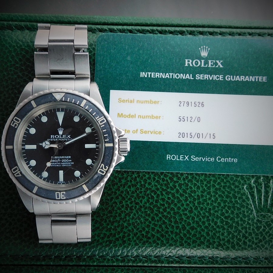 そんな今回の5512、2015年1月15日に日本ロレックスでのオーバーホールを完了した完全本物としての証を残した一品。ダイアルのSUBMARINERトップ表示のように、オーバーホール時のロレックスのサービスダイアルで、当時、ダイアル、3針、チューブ、竜頭、ルミナスポイントも交換。ダイアルの夜光はルミノーバであることはビンテージファンからすると、ちと悲しいところ、ブレスは9315、フラッシュフィット382で年代としては1977年製の巻3連のツインロック、溝有り純正ブレス多少の伸び程度で、日本ロレックスOH時のギャランティーカード、5512専用箱ではないが、ロレックスの純正箱をおつけしご紹介させて頂こう。