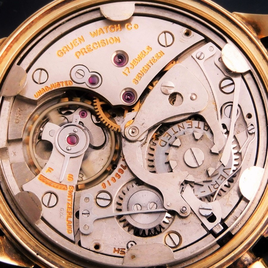 1920年頃からスイス、ビエンヌに工場を設立し、1925年キャリバー117の開発により角型のマニュファクチュールとしてアメリカを代表するブランドはスイスへとその軌跡と野望は広がり、角型での開発では一目置かれる存在となった。当然その技術は生かされ、1928年にその特許の申請の名に残されたように同じビエンヌの地でムーブメントを製作していたロッレクスとエグラーへの資本参加へとなりプリンスキャリバー”300″の開発となったのは事実である。ドイツ人であるグリュエン創業者””が、同じくしてドイツで生まれ育った”ハンス・ウイルスドルフ”との謎たる因果関係があったのだろうかわからないが、その後グリュエンが突然1936年に資本参加を降りると同時に角型としての自社キャリを開発し世界にその度肝を抜くモデル発表したのも事実である。言わずと知れたカーベックス”Cal.331″の誕生である。しかしそのグリュエンにおけるカーベックスの真実のストーリーは、当時のスイス時計業界での薄型キャリバーこそ最高の技術を要すると言われたように、薄型を極めん為のプロセスであつたのかもしれない。そんな真実の野望を実現させたのが、”VERI-THIN”ファーストキャリの”Cal.430″である。ご存知カーベックス”Cal.440”のベースともなった機械である。
