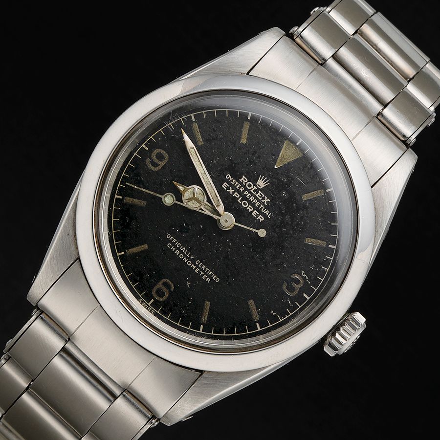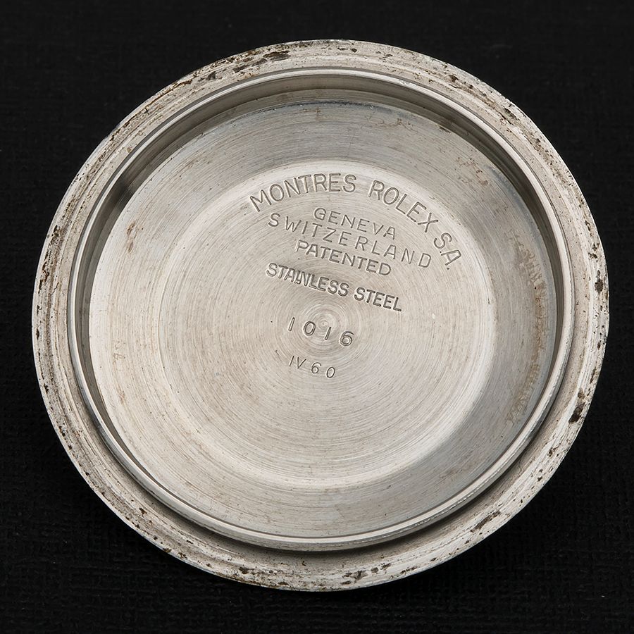 | 【商品説明】 1930年代よりオフィシャルスポンサードとしてキャンプの設置、食事など、一切の経費を負担していたロレックス社の思いとは裏腹に実際、エベレストに登頂したエドモンド・ヒラリーとシェルパ族(チベット)のテンジン・ノルゲイが腕に嵌めていたの返品することを条件としたロレックスの時計ではなくスミスであり、当時ロレックスの時計は登山リュックの中に位舞い込んでいたというコメントを残しているが実際は謎である。 更に1954年のチラシで『EVEREST Leader’s Tribute to Rolex』の見出しであるのにはリファレンスナンバーが記載されていない。当然、今までは”Ref.6350”がファーストであり、ジョン・ハント率いる登山隊が装着していたのも”Ref.6350”であると言われ続けてきたが、近年それは”Ref.6298”ではないかと言われている。確かに一般市場としてチラシに掲載されたのは”Ref.6350”ではあるとされるが、そのチラシの画像からはクロノメーターではないノンクロノメーターの画像であるのは誰が見てもわかるはずである。ロレックスのオフィシャルサイトでもその存在を一切触れていないのはなぜだろうか。1953年に登場としたエクスプローラーは4つあり、Ref.6098、6298、6350、6150となるが、年代はすべて同じ年代に登場している。当然搭載キャリバーもCal.775であるが、問題となっているのはエベレスト登山時の彼らの写真であるが、ノンクロノメーターであった可能性か強く、そうなるとRef.6298,6150のいずれかとなる。当初はノンクロノメーターとして開発され、既にエクスプローラーとして誕生していたRef.6298をジョン・ハント卿を中心とした登山隊がロレックスから借り受けることで、エベレスト登頂をきっかけに、当然、単体のモデルとしての存在として売り出す必要があったロレックスが、その時点で存在しなかったモデルRef.6350をRef.6150ケースを流用し、当然、クロノメーターとして名を売っていたロレックスがクロノメーターRef.6350を誕生させ、ヒラリー夫人が装着していないにも関わらず、伝説のストーリーを作ってしまったのではないかと考えるのが自然ではないだろうか。 今回ご紹介するのは当然1016。その中でも1960年という特別な製造年を持つ個体。当然、他モデルと全く違うダイアルの製造工程を持つエクスプローラーのミラーダイアルだけにオーラは半端ではない。インデックス部分のみを型取り、ダイアル全体にメラニン系の樹脂を塗布し乾燥系高炉で焼き付けた後、インデックスの型を取り、窪んだ部分に流動形の夜光を流し込む。当然年月が経つと水分だけが蒸発し窪んだ塗料だけが現代に残る。当然今回ご紹介する一品もインデックス部分だけが窪み独特のミラーダイアルの光沢感を残し、ビンテージの匂いがプンプンしオーラ丸出しの凄い一品である。更に1960年にしかない1016ストーリー”OCC”。1960年頃よりロレックスはアメリカ議会でのラジウム騒動からラジウムから夜光を変更していき、それにより夜光力は維持しながら放射線のない単体の硫化亜鉛系夜光に変更されていった。その為6時位置にSWISSのみの文字が塗布され60年から61年までの”SUPERLATIVE”の文字の無いOFFICIALLY CERTIFIED CHRONOMETERの3列文字刻印となる。機械は1963年から1570が登場するようにその前の1560キャリバー18000振動のロービートを奏で、60年代初期までのバタフライローターか最高のローターサウンドを響かせる。針は後期のショートのトリチウム針で交換されているが純正のオリジナル。最高のこの一品、手にすることは不可能とも言われる1960年製造のエクスプローラー1016のOCC。持つべき者を幸せにすることは間違いない。 OYSTER PERPETUAL -EXPLORER- BLACCK GLOSS DIAL “OCC” オイスターパーペチュル ”エクスプローラー” ブラックミラーダイアル OCC R e f . 1 0 1 6 ☆☆☆ 1960年製造ビンテージコンディション ☆☆☆ (メンズ/平置日差;+10秒/振り角;260°/片振:0.6ms/拘束角;52°) ※タイムグラフ実測での数値ですが、環境により変化致しますので、あくまでも目安すとしてお考え下さい。 ☆☆☆ オリジナルコンディション ☆☆☆ ダイアル裏の爪足の偽造痕のチェック、リダン痕のチェツク済み※ダイアルも当時のオリジナルコンディション 完全オールオリジナルコンディション ☆ 1960年製造純正 オリジナル ”光沢ミラーブラックOCC” ダイアル ☆ 【刻印】:ROLEX OYSTER PERPETUAL EXPLORER OFFFICIALLY CERTIFFIED CHRONOMETER SWISS 【状態】:(1960年の希少なOCCダイアルは60年ミラー独特の柔らかな光沢に経年の中で塗料がダイアル全体に飛火した様は最高のビンテージの漂いを感じる) ☆ 1960年製造純正 オリジナル 硫化亜鉛系夜光アワーマーカーズ & ベンツ針 ☆ 【状態】:(経年の腐食が見られますが、ビンテージとしての最高の漂いを感じさせる) ☆ 1960年製造純正 ステンレススティールフィクスベゼル ☆ 【状態】:(当社で磨きはしてございませんので小キズはござますが目立つキズ、打痕などはございません) ☆ 1960年製造純正 ステンレスステ