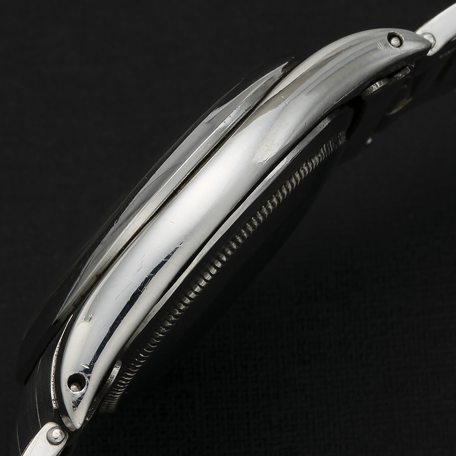 | 【商品説明】 1930年代よりオフィシャルスポンサードとしてキャンプの設置、食事など、一切の経費を負担していたロレックス社の思いとは裏腹に実際、エベレストに登頂したエドモンド・ヒラリーとシェルパ族(チベット)のテンジン・ノルゲイが腕に嵌めていたの返品することを条件としたロレックスの時計ではなくスミスであり、当時ロレックスの時計は登山リュックの中に位舞い込んでいたというコメントを残しているが実際は謎である。 更に1954年のチラシで『EVEREST Leader’s Tribute to Rolex』の見出しであるのにはリファレンスナンバーが記載されていない。当然、今までは”Ref.6350”がファーストであり、ジョン・ハント率いる登山隊が装着していたのも”Ref.6350”であると言われ続けてきたが、近年それは”Ref.6298”ではないかと言われている。確かに一般市場としてチラシに掲載されたのは”Ref.6350”ではあるとされるが、そのチラシの画像からはクロノメーターではないノンクロノメーターの画像であるのは誰が見てもわかるはずである。ロレックスのオフィシャルサイトでもその存在を一切触れていないのはなぜだろうか。1953年に登場としたエクスプローラーは4つあり、Ref.6098、6298、6350、6150となるが、年代はすべて同じ年代に登場している。当然搭載キャリバーもCal.775であるが、問題となっているのはエベレスト登山時の彼らの写真であるが、ノンクロノメーターであった可能性か強く、そうなるとRef.6298,6150のいずれかとなる。当初はノンクロノメーターとして開発され、既にエクスプローラーとして誕生していたRef.6298をジョン・ハント卿を中心とした登山隊がロレックスから借り受けることで、エベレスト登頂をきっかけに、当然、単体のモデルとしての存在として売り出す必要があったロレックスが、その時点で存在しなかったモデルRef.6350をRef.6150ケースを流用し、当然、クロノメーターとして名を売っていたロレックスがクロノメーターRef.6350を誕生させ、ヒラリー夫人が装着していないにも関わらず、伝説のストーリーを作ってしまったのではないかと考えるのが自然ではないだろうか。 今回ご紹介するのは当然1016。その中でも1960年という特別な製造年を持つ個体。当然、他モデルと全く違うダイアルの製造工程を持つエクスプローラーのミラーダイアルだけにオーラは半端ではない。インデックス部分のみを型取り、ダイアル全体にメラニン系の樹脂を塗布し乾燥系高炉で焼き付けた後、インデックスの型を取り、窪んだ部分に流動形の夜光を流し込む。当然年月が経つと水分だけが蒸発し窪んだ塗料だけが現代に残る。当然今回ご紹介する一品もインデックス部分だけが窪み独特のミラーダイアルの光沢感を残し、ビンテージの匂いがプンプンしオーラ丸出しの凄い一品である。更に1960年にしかない1016ストーリー”OCC”。1960年頃よりロレックスはアメリカ議会でのラジウム騒動からラジウムから夜光を変更していき、それにより夜光力は維持しながら放射線のない単体の硫化亜鉛系夜光に変更されていった。その為6時位置にSWISSのみの文字が塗布され60年から61年までの”SUPERLATIVE”の文字の無いOFFICIALLY CERTIFIED CHRONOMETERの3列文字刻印となる。機械は1963年から1570が登場するようにその前の1560キャリバー18000振動のロービートを奏で、60年代初期までのバタフライローターか最高のローターサウンドを響かせる。針は後期のショートのトリチウム針で交換されているが純正のオリジナル。最高のこの一品、手にすることは不可能とも言われる1960年製造のエクスプローラー1016のOCC。持つべき者を幸せにすることは間違いない。 OYSTER PERPETUAL -EXPLORER- BLACCK GLOSS DIAL “OCC” オイスターパーペチュル ”エクスプローラー” ブラックミラーダイアル OCC R e f . 1 0 1 6 ☆☆☆ 1960年製造ビンテージコンディション ☆☆☆ (メンズ/平置日差;+10秒/振り角;260°/片振:0.6ms/拘束角;52°) ※タイムグラフ実測での数値ですが、環境により変化致しますので、あくまでも目安すとしてお考え下さい。 ☆☆☆ オリジナルコンディション ☆☆☆ ダイアル裏の爪足の偽造痕のチェック、リダン痕のチェツク済み※ダイアルも当時のオリジナルコンディション 完全オールオリジナルコンディション ☆ 1960年製造純正 オリジナル ”光沢ミラーブラックOCC” ダイアル ☆ 【刻印】:ROLEX OYSTER PERPETUAL EXPLORER OFFFICIALLY CERTIFFIED CHRONOMETER SWISS 【状態】:(1960年の希少なOCCダイアルは60年ミラー独特の柔らかな光沢に経年の中で塗料がダイアル全体に飛火した様は最高のビンテージの漂いを感じる) ☆ 1960年製造純正 オリジナル 硫化亜鉛系夜光アワーマーカーズ & ベンツ針 ☆ 【状態】:(経年の腐食が見られますが、ビンテージとしての最高の漂いを感じさせる) ☆ 1960年製造純正 ステンレススティールフィクスベゼル ☆ 【状態】:(当社で磨きはしてございませんので小キズはござますが目立つキズ、打痕などはございません) ☆ 1960年製造純正 ステンレスステ