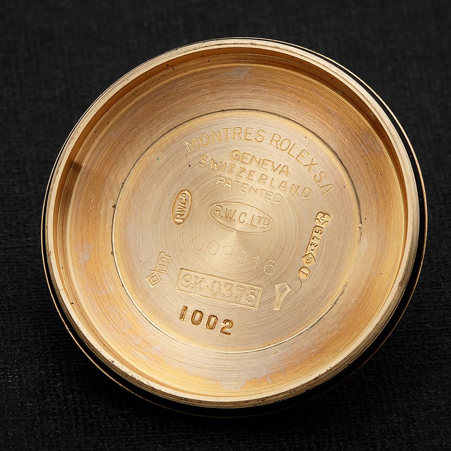 | 【商品説明】 1885年バーミンガム 83番 ヴィセストリートにワークショップを構え、ティーカップやスプーンなどの銀細工を中心にイギリス王室などにも献上したイギリスを代表シルバーメーカーであった”ベンジャミン・ブリテン”。 金無垢細工も手掛け、金無垢の懐中時計のチェーンなども制作、金無垢の時計のケースやブレスレットにまでクオリティーの高い商品を世に残していった。1934年から世界的にいち早く始まった関税対策も含めてロレックスも含め、数多くのメーカーがイギリスに輸出する際に自社商品をイギリスで制作したり様々な方法で回避するのにロレックスも当時、それが理由かどうかはさだかではないが、”ベンジャミン・ブリテン”に時計のケースやチェーンなど依頼をした歴史がある。 ベンジャミン・ブリテン。インポートの場合のメーカーズのロゴは”四角い枠の中にB&S、買う者全てにそのロゴはステイタスを与えた。 今回のブレスは9金無垢のオイスターチェーンブレス。特別という存在は特別という存在にだけ素直に存在価値を見出すように、このブレスの存在だけでも価値があるにも関わらず、このブレスはあるモデルを引きだたせる為に存在した。 “ROLEX OYSTER PERPETUAL AIRKING 9 KSOLID GOLD” ご存知、誰でも知るところのエアキングである。現在まで続くオイスターパーペチュアルモデルの中で誰でも知る身近なステンレスモデルとしての存在だが、1960年代だけイギリス市場向け特別なオーダー品としてイギリスに輸入されたエアキングが存在する。 それが金無垢エアキングでRef.5500である。当然ご存知の通り、一般向けとして販売されたエアキングに現在も含め、発売されたことはない。5500自体も5506のカップゴールド 以外、コンビ、ステンレスのみである。 当然、特別なオーダー品としてのプロセスは金無垢ということだけでなく、そこにうは特別にインポートされた証としての存在がある。フランス市場向けとした裏蓋のロレックスのロゴ刻印が有名なようにその証として裏蓋の内側にはイギリスの何処の港にインポートされたかを示す”インポートマーク”、何年にインポートされたかを示す”ヒストリックマーク”、そしてスイスの金無垢のホールマーク以外にイギリスの金無垢のホールマークも刻される。それはラグの裏側にも刻印がある。そしてコメックスやミリタリーにも必要不可欠となる特別なオーダー品の証である同じく内側のセンター部分に存在するラグ位置と同じシリアルナンバーが刻印される。 全て特別という存在が明かす最高のストーリーをこの一品は備えている。 ROLEX OYSTER PERPETUAL Ref.5500 9K SOLID GOLD ロレックス オイスターパーペチュアル エアキング Ref.5500 9金無垢 1961年イギリス.ロンドンにてインポート。1960年製造. ★★★ R O L E X ★★★ 9K Solid Champagne Gold “Air King” London Assay Office import mark in 1974 9金無垢シャンパンゴールド “エアキング” 1974年ロンドン検定インポートマーク Ref.5500 W/ 9K SOLID GOLD B&S Chean Bracelt ☆☆☆ 1960年頃製造ビンテージ コンディション ☆☆☆ 現在(歩度:+15秒/振角:255前後/片振角:1.0) ※温度、湿気など環境に変化致しますのでこの数値でのお約束ではございません) 動作保証:基本的に歩度のみの±60秒前後以内とした保証となります(動作保証3ヵ月) ☆☆☆ “1966年頃製造”ファクトリーオールオリジナル ☆☆☆ ダイアル裏の爪足の偽造痕のチェック、リダン痕のチェツク済み (バンド以外は完全オリジナル)※ダイアルも完全オリジナルです。 【ダイアル】1960年頃製造純正シルバーグロス ダイアル 【刻印】(ROLEX OYSTER PERPETUAL Air-King SUPER PRECISION SWISS MADE) 【状態】年代を全く感じさせない最高の状態である 【針 & アワーズインデックス】1960年頃製造純正バー アワーマーカーズ W/トリチウムドット夜光 & アルファー夜光針 【状態】ドット夜光、針の夜光もややヤケ程度で最高のコンディション 【ベゼル】1960年頃製造純正 9金無垢スムースベゼル 【状態】小キズ程度で目立つ打痕などのキズはございません。※磨きはしてございません 【リューズ】1960年頃製造純正18金無垢張りツインロックリュウズ 【状態】チューブの閉まりも含め完璧と言っても過言ではない最高の一品です ![]() 【ミドルケース】1960年頃製造純正 9金無垢シャンパンゴールド ミドルケース 【刻印】●12時位置:(5500)●6時位置:(——–) 【サイズ】34mm(リューズガード含めず/含み36mm)×42mm(両側ラグの先端まで) 【状態】小キズ程度で目立つ打痕などのキズはございません。ヤセはややございますが、かなり状態は最高です 【スクリューバックケース】1960年頃製造純正 9金無垢 スクリューバックケース 【刻印】ケース裏:(MONTRES ROLEX SA GENEVA SWIZERLAND PATENTED 9K 375 1002 ) 【状態】オープナーのキズも無く、打痕、凹みも一切なくかなり良い状態であると感じています。 【クリスタル】1990年以降、ロレックス純正アクリル風防 【状態】極小のキズはございます。磨きで多少落としています。 【