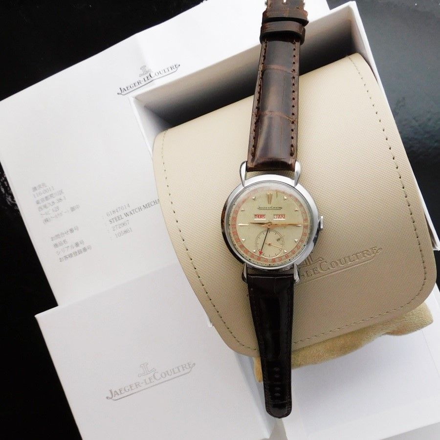 激稀少1940年頃☆ジャガー・ルクルト社OH済ギャラ純正箱付属★ジャガールクルト トリプルカレンダー★ティアドロップ☆伝説Cal.464純正尾錠