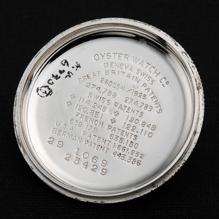 | 【商品説明】 1890年頃から戦争という世界から生み出された腕時計という世界、それ以前、女性ものの腕時計は存在したが、男性用の腕時計は戦火の中で、ポケットから取り出す手間を省く為に懐中に紐を巻いて、腕に嵌めるという自然発生的なものから誕生した。そして1900年のパリ万博でオメガが初めてWRISTWATCHという言葉を用いて時計を出品した。 それから4年後、24歳の若き青年”ハンス・ウィルドルフ”が、エグラー社(現ロレックス ヒエンヌ社)とのムーブメントの惚れ1905年にイギリスで義弟のアルフレットデイビスと一緒に”W&D社”を立ち上げた。その後、第一次世界大戦勃発により、ドイツ人名であるハンスは急遽、敵国であるイギリスであるが為に”ロレックス社”を1915年に立ち上げた。それは最初に1915年7月に認可された特許ナンバー”70926”(塵を遮断するケース)から見るように砂ぼこりの多い当時の時代、塵から守る時計の必要性から始まり、何を人は求めるのか、そしてその結果売れるものとは何かを求め、確固たる自信の下で販売していった。 それは1922年、特許ナンバー”197208”のリューズのついた本体をアウターのねじ込みケースで覆い隠すという防水ケースへと発展し、1926年6月10月18日防ケース特許ナンバー”120851”、ねじ込みリューズ初の特許ナンバー”120848”により、ハンスは確固たる自信の中である決意を下した. 『ドーバー海峡をこの腕時計をつけて泳がせよう』 それは1927年10月7日、イギリスロンドンの英国紙”デイリーメイル”の速記者であるメルセデス・グライツ嬢がドーバー海峡を渡るという女性では世界で2人目の快挙となった。そしてそれは、ドーバー海峡を渡ったという事実よりもその腕に嵌められていたのがロレックス社の時計であったことに世界は驚愕した。ハンスが、ここまでの筋書きを予測していたかどうかは、現在では謎であるが、ハンスが、グライツ嬢がわたって一か月後、11月24日付けの”デイリーメイル”の第一面をロレックスの腕時計が全面広告として飾った前代未聞の出来事は、当時のロンドン市民を驚かせた。そしてその裏には4万スイスフラン”1600ポンド”(当時で日本円にして270万円)の膨大な経費がかかったことは事実であり、ドーバー海峡を渡る以前から売れるまでの筋書きが用意されていたのかもしれない。 そんなロマンを感じるストーリーを現実とする逸品としてオイスターの創世記を代表するモデルが今回、ご紹介する一品である。 リファレンスは”Ref.1069”。1072のファーストモデルとされる3種のうちのクッションケース1072を引き継ぎ、変わらぬデザインで30mmを超えるクッションの圧倒的存在感が最高のステイタスを感じることが出来る。機械も10径ハーフとしての700系へと導く最高の18000振動のテンプサウンドを聞かせてくれる。テンプは通常のチラねじからリム部分を設けそこにチラねじを装備することでテンプが回転する時にかかる抵抗力を軽減し、不安定した姿勢差を誇った。竜頭はオニオンから6mmのビッグブロックのオイスター竜頭へと、パテントもUSAのパテントナンバーの変更も行っている。ダイアルは希少なサイエンティフィックデザインであるが、オールドリダンとしての状態で、一見、オリジナルコンディションと見間違えるほど。この年代としては最高のコンディションであることは間違えない。 ★★★ R O L E X ★★★ CUSHION ENGINE BEZEL “THE FIRST GENERATION WATERPRROF” CIRCA 1930’s 防水セカンドモデル クッション “エンジンベゼル” 1930年頃 R e f . 1 0 6 9 ☆☆☆ 1930年頃製造ビンテージオールオリジナルコンディション ☆☆☆ 現在(歩度:+100秒/振角:205前後/片振角:1.0※温度、湿気など環境に変化致しますのでこの数値でのお約束ではございません) 当社工房にてテンプ一式洗浄、注油済、精度テスティング、ダイアル裏のリダン痕、改造痕のチェック済 バンド、風防以外完全純正オリジナル※ダイアルはオールドリダン.尾錠は現行純正 ☆【ミドルケース】1930年頃製造純正ステンレススティール “クッション” ケース 【状態】90年前の漂いが感じられる独特の色のくすみ感が最高、痩せもほとんど感じられない ![]() ☆【バックケース】1930年頃製造純正ステンレス スクリューバックケース ☆ 【刻印】ケース裏:(OYSTER WATCH CO GENEVA SWISS GREAT BRITAN PATENTS 260554/1925 274.733 274.739 SWISS PATENTS 114.948 + 120848 120.851 122.110 FRENCH PATENTS 638.179 638.180 U.S.A PATENT 1.661.232 GERMAN PATENT 1069 23429 【サイズ】32mm(リューズガード含めず/含み35mm)×37mm(両側ラグの先端まで) 【状態】オープナーによる多少のキズはは当然ござまいすが、目立つキズ、、打痕などはごさまいせん) ☆【ベゼル】1930年頃製造純正ステンレススティール”エンジン” ベゼル ☆ 【状態】目立つキズ、打痕も無くかなりいい状態であると感じています ☆【リューズ】1930年頃製造純正ステンレススティール”ツインロック”オイスター”6mmビッグ”竜頭 ☆ 【刻印】(経年により刻印が見えなくなっています