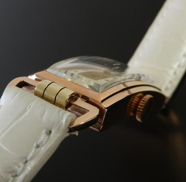 そんな今回の一品、再度言っておこう。レアと呼ばれるものは、たいていひとつのパーツが、他にはない希少なパーツを採用しているとか、数が絶対的に少ないと言うものであるが、今回の一品、20×48mmというバナナウオッチたる堂々とした対比の湾曲ケース。更に可動式のフレキシブルなラグ、そしてグリーンゴールドとローズゴールドのバイメタル。もうこれ以上の一品は存在しない。ブランド力としては劣るが、希少性、そのデザイン力も含め、この世のものではもはやないものとしてこの一品に価格をつけて頂きたい。