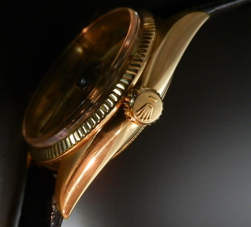1932年、ロレックス史に残る自動巻が開発されてから、バブルバックという特別な世界が続き、1955年”キャリバー745”が登場すると同時に、自動巻としてキャリバーナンバーを与えられた620、630サイズはNAという伝説は終焉を迎えることとなる。そしてそれはそれまでの片方向巻き上げとしての歴史をも変え、ビディネーターと同じく世界初、両方向巻き上げとしての新たな歴史を刻むこととなる。1950年、それは1030というキャリナンバーを与えられ、そこにデイト機能をつけた1035、そして24時間GMT機能を搭載した1036が派生として誕生し、そしてそれは現在までロレックス全モデルの中で最上級モデルとしての位置づけとしたデイデイトという伝説にその名を刻んだのが”キャリバー1055”である。それは1030と同じく、ロレックスとして初となる。緩急針を無くし、ミーンタイムスクリューのみで精度を調整した。緩急受けに刻まれた”1/4 TURN REG SCREWS 10 SEC”のとおり、ミーンタイムスクリューネジを1/4回転させることで、10秒調整するという調整方法まで機械に刻むこととなった。そしてそれは1956年、テイデイトファーストナンバーとして6500、そして6511を誕生させ同時、セカンドとなる伝説6611を誕生させた。当初はステンレススティールモデルも存在し、この頃からラグジュアリーモデルとしての最高地位として確立させダイヤモンドを装備させた6612、そして6613をも誕生させた。当然、6611は現在、市場で出回ることも無く、幻のような存在となっていることは確かでであり、最高地位を極めたデイデイトのモデルとして実質的にはファースト的存在であることも確かであり、今回の一品のように風防以外、フェイスとしては純正パーツでここまでのコンディションはないだろう。当然バーインデックスをオリジンとした現行に繋がるアワーズ、針のバーという存在は完全に56年に登場した最高のオリジンの証であることは確かである。その存在すら奇跡と言っても過言ではない今回の一品、その驚きはシャンパンゴールドとピンクゴールドの中間色となる”ライトピンクゴールド”というウキウキするマテリアルに対しての感動と喜びを見つめるだけで感じてしまうと言っても過言ではない。デイトは当然、オリジンの証である”スペイン語表示”。”一生に一度の一品”とは、『歴史的価値、絶対数の希少性、そして美としての存在』、それらすべてを我がものとしたものだけがその存在価値を見出すことができるのであろう。
