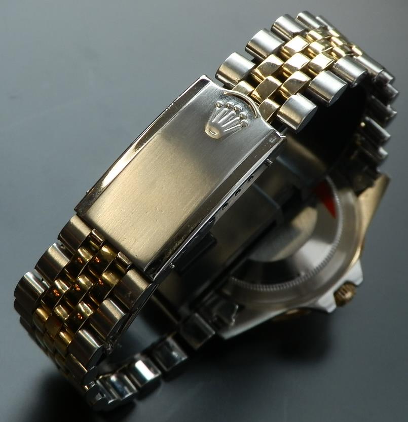 70年代のマットダイアルから1983年頃からダイアルはより光沢を増す為にダイアルの仕上げを変えてきたが(素材に関しての細かいコメントは、9月発売のパワーウオッチで紹介させて頂きます)初期の素材はコーティングが剥がれやすく、内側の赤い染色が表面に出やすくなったここともあり、その後早々にダイアルの変更がなされた。1990年頃からそれはメーカーオーバーホール時の交換ダイアルともなり、その独特の色合いからトラの目のような鋭い眼光のような強い眼差しで”タイガーアイ”と世界中の人々を魅了した。当然、今回の一品も”タイガーアイ”で今回のオーバーホールでダイアルが交換されている為、夜光はルミノーバとなるが、1954年のファーストから続く”フジツボ”と言われるアワーズ、そしてアプライドの立体的なロレックスのエンブレム、その良き人の手で組み立てられた時代の最後のセカンドモデルとなる”1675”いう世界を推奨した最後のGMTマスターであることの証はしっかりと存在する。当然くどいようだがセカンドモデルたる金無垢コンビモデルとしての最高の美を飾るこの一品であることは確かであり、日本ロレックスでオーバーホールしたことで100年以上の時をこれから刻む意思を感じさせるように、この一品がここに存在することを皆様にお伝えしたい。時、分針、24時間針、竜頭、チューブ、そしてダイアル交換、2015年7月31日から2017年7月30日までの2年間のメーカー国際保証付き、ブレスは14金無垢コンビの純正5連ジュビリーブレス。USブレスとしてロレックスのエンブレムが通常よりは大きく、トリ足と呼ばれたシェイプに近い大きなロゴとしてロレックスコレクターから人気を博した初期ブレスを装着しての出品とさせて頂きます。