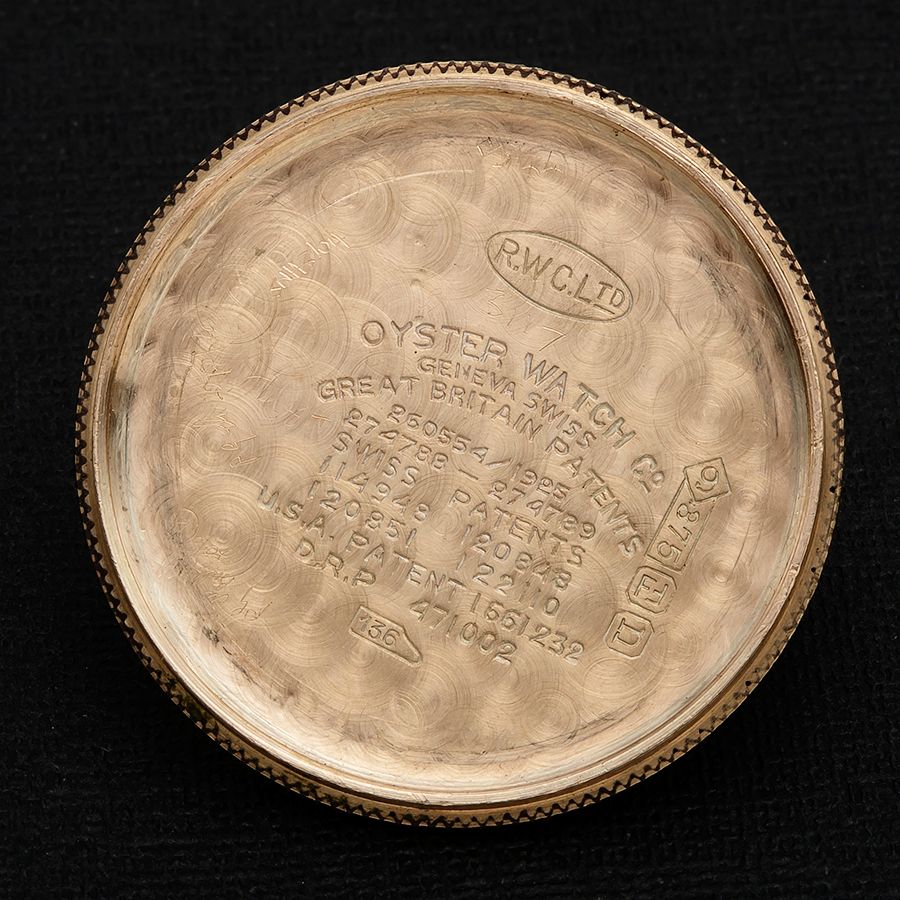 | 【商品説明】 1890年頃から戦争という世界から生み出された腕時計という世界、それ以前、女性ものの腕時計は存在したが、男性用の腕時計は戦火の中で、ポケットから取り出す手間を省く為に懐中に紐を巻いて、腕に嵌めるという自然発生的なものから誕生した。そして1900年のパリ万博でオメガが初めてWRISTWATCHという言葉を用いて時計を出品した。 それから4年後、24歳の若き青年”ハンス・ウィルドルフ”が、エグラー社(現ロレックス ヒエンヌ社)とのムーブメントの惚れ1905年にイギリスで義弟のアルフレットデイビスと一緒に”W&D社”を立ち上げた。その後、第一次世界大戦勃発により、ドイツ人名であるハンスは急遽、敵国であるイギリスであるが為に”ロレックス社”を1915年に立ち上げた。それは最初に1915年7月に認可された特許ナンバー”70926”(塵を遮断するケース)から見るように砂ぼこりの多い当時の時代、塵から守る時計の必要性から始まり、何を人は求めるのか、そしてその結果売れるものとは何かを求め、確固たる自信の下で販売していった。 それは1922年、特許ナンバー”197208”のリューズのついた本体をアウターのねじ込みケースで覆い隠すという防水ケースへと発展し、1926年6月10月18日防ケース特許ナンバー”120851”、ねじ込みリューズ初の特許ナンバー”120848”により、ハンスは確固たる自信の中である決意を下した. 『ドーバー海峡をこの腕時計をつけて泳がせよう』 それは1927年10月7日、イギリスロンドンの英国紙”デイリーメイル”の速記者であるメルセデス・グライツ嬢がドーバー海峡を渡るという女性では世界で2人目の快挙となった。そしてそれは、ドーバー海峡を渡ったという事実よりもその腕に嵌められていたのがロレックス社の時計であったことに世界は驚愕した。ハンスが、ここまでの筋書きを予測していたかどうかは、現在では謎であるが、ハンスが、グライツ嬢がわたって一か月後、11月24日付けの”デイリーメイル”の第一面をロレックスの腕時計が全面広告として飾った前代未聞の出来事は、当時のロンドン市民を驚かせた。そしてその裏には4万スイスフラン”1600ポンド”(当時で日本円にして270万円)の膨大な経費がかかったことは事実であり、ドーバー海峡を渡る以前から売れるまでの筋書きが用意されていたのかもしれない。 そんなロマンを感じるストーリーを現実とする逸品が、今回ご紹介する逸品である。”リファレンスは1072”。実際ドーバー海峡を渡ったのはオクタゴンのケースモデルであるが、1926年にロレックスが初めてとなるねじ込み式の防水スクリューバックケースを採用したのが、メルセデス・グライツ嬢がはめたオクタゴンと今回のクッションケースの2種であった。特に今回の逸品”2081”はクッションケースで横径が32mm、竜頭を入れると35mmとなる為、当時としてはかなり大きく感じられる。販売した当時の価格で、ステンレスのモデルでアメリカ向けとしてのチラシに$72とある。ちなみに9金無垢が$130,18金無垢が$180となる。又、ロレックスは昔からオプションとして姿勢差調整、自社におけるクロノメーターが許された時代に公式クロノメーターの検定審査を通すことなどを別料金としてオプション設定していた。当時は高級仕上げとして$47オプショナルプライスとした。 ★★★ R O L E X ★★★ THE FIRST WATERPRROF MODEL “9K SOLID GOLD CUSHION” SMOOTH BEZEL ザファースト防水モデル “9金無垢クッション” スムースベゼル R e f . 1 0 7 2 ☆☆☆ 1926年頃製造ビンテージオールオリジナルコンディション ☆☆☆ 現在(歩度:+30-60秒/振角:235前後/片振角:0.5※温度、湿気など環境に変化致しますのでこの数値でのお約束ではございません) 当社工房にてテンプ一式洗浄、注油済、精度テスティング、ダイアル裏のリダン痕、改造痕のチェック済 バンド、風防以外完全純正オリジナル※文字盤はオールドリダン。尾錠は現行純正 ☆【ミドルケース】1926年製造純正 9金無垢シャンパンゴールド “クッション” ケース 【状態】当社でバフがけ程度で痩せの無い状態で仕上げておりますので状態はかなり最高です ![]() ☆【バックケース】1926年製造純正 9金無垢シャンパンゴールド スクリューバックケース ☆ 【刻印】ケース裏:(OYSTER WATCH CO GENEVA SWISS GREAT BRITAN PATENTS 260554/1925 274.733 274.739 SWISS PATENTS 114.948 + 120848 120.851 122.110 FRENCH PATENTS 638.179 638.180 U.S.A PATENT 1.551.252 GERMAN PATENT 443.385 1072 【サイズ】32mm(リューズガード含めず/含み35mm)×37mm(両側ラグの先端まで) 【状態】オープナーによる多少のキズは多少ございますが90年経っているとは到底思えない最高のコンディションです ☆【ベゼル】1926年頃製造純正 9金無垢シャンパンゴールド”エンジン” ベゼル ☆ 【状態】目立つキズ、打痕も無くかなりいい状態であると感じています ☆【リューズ】1926年頃製造純正 9金張りシャンパンゴールドオイスター”6mmビッグ”竜頭 ☆ 【刻印】(OYSTER PATENT) 【状態】打痕、擦り傷も無く最高のコンディシ