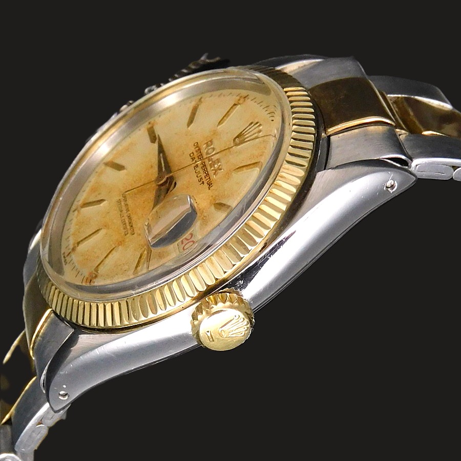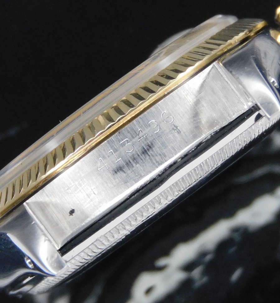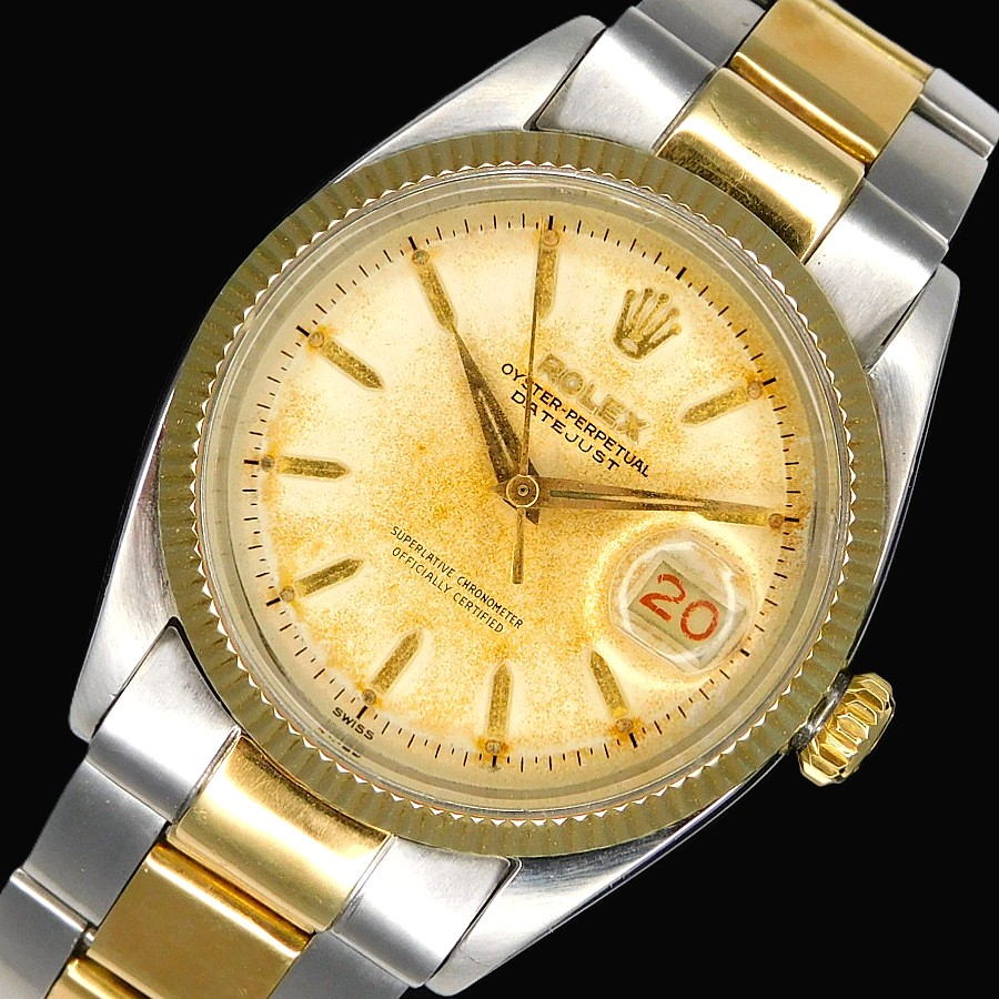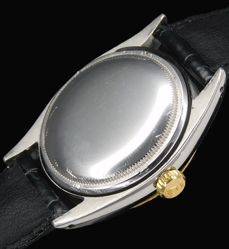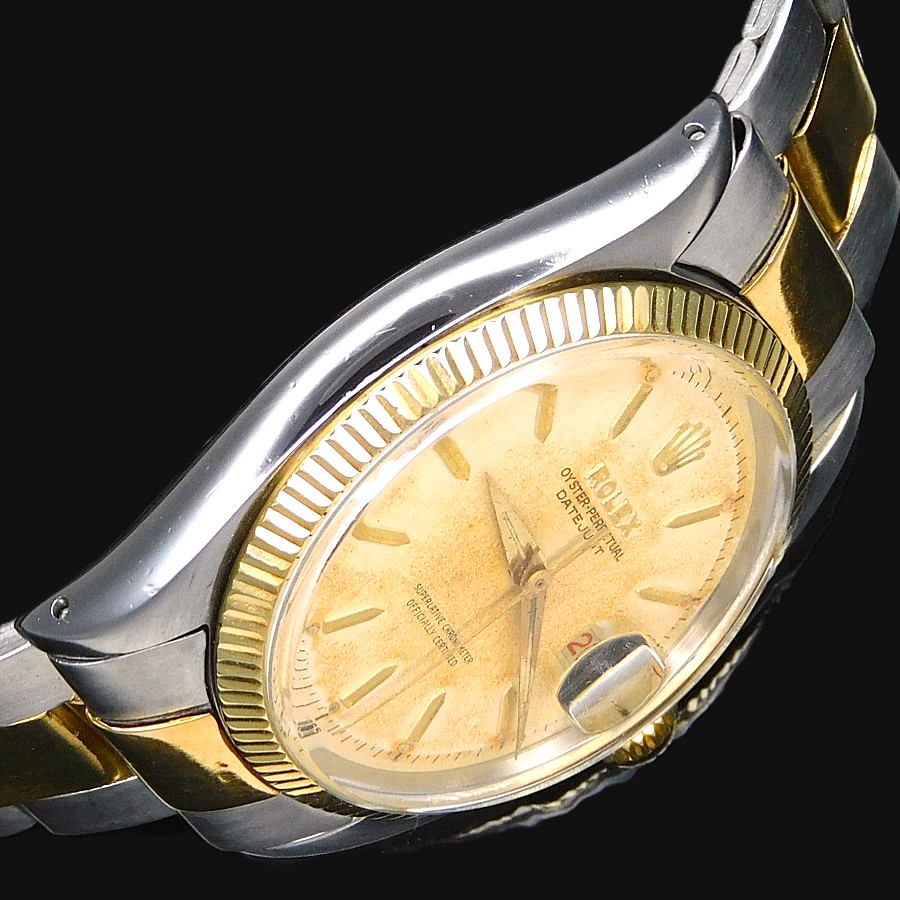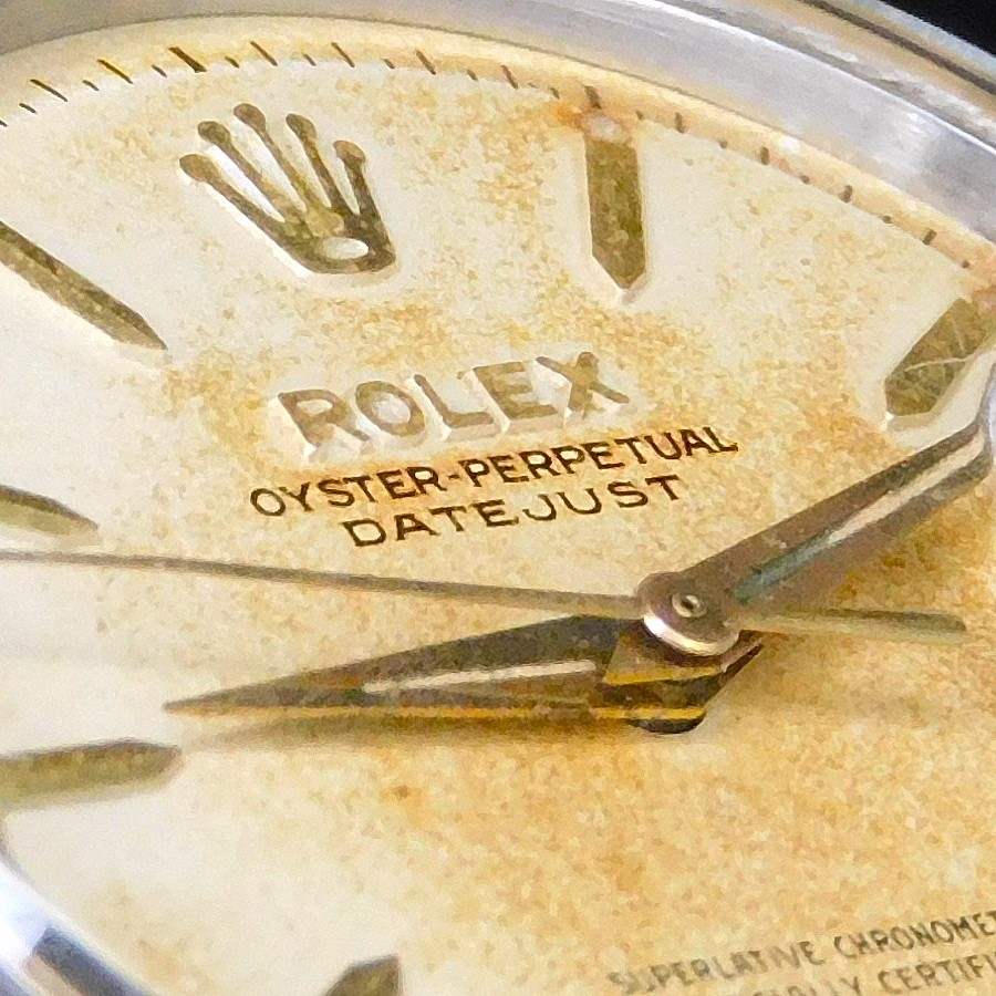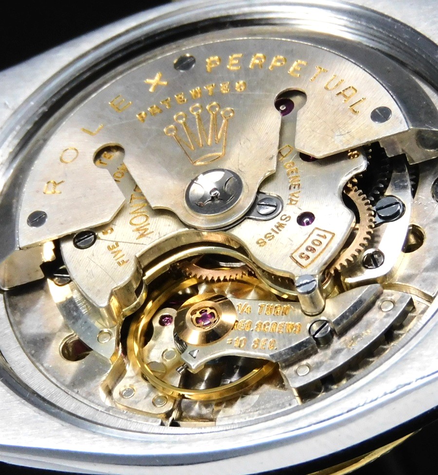| 【商品説明】 1945年、創業40周年のパーティーの席で、世界で始めて小窓に日付が自動的に変わる腕時計が発表された。それはジュネーブロレックス創業者”ハンス・ウイルスドルフ”の最愛の妻でありロレックスジュネーブ社の取締役でもあった” フローレンス・フランシス・メイ・クロッティ”、れ込むことで、回転時の誤作動を軽減させた。この機構は現在のベースにもなっている。そして今ままでの機械部にとりつけてあったローターと連結する車を単独のパーツにすることで、修理時の分解、組み立て作業が大幅に軽減した。更に始めとなる緩急針を無くすことで、振動や衝撃による時間の乱れを無くした。全てにおいてそれまでの620のDNAを取り払い新しい時代の幕開けとなったのが1065であり、その機械を搭載した6605デイトジャストが本当の意味でのハンス・ウイルスドルフが形にしたかった真実であったのは間違いない。文字盤は1955年頃よりロレックスの歴史で最初と最後となる59年頃までのROLEXの文字が立体的に表現された特別という時期に誕生したクオリティーの高い作り。当然、当社でオーバーホールはさせて頂きましたので、最高の逸品として皆さまにお届けしよう。 14K Solid gold Bezel & Stainless Steel “DATEJUST” Three-dimentional ROLEX letter 14金無垢エッジベゼル ”デイトジャスト” オリジナル文字盤 w/立体的ROLEXレター R e f . 6 6 0 5 ☆☆☆ 1958年製造ビンテージ コンディション ☆☆☆ 現在(歩度:+22秒/振角:250前後/片振角:0.3※温度、湿気など環境に変化致しますのでこの数値でのお約束ではございません) ※動作保証:基本的に歩度のみの±60秒前後以内とした保証となります(動作保証3ヵ月) ☆☆☆ “1958年頃製造”ファクトリーオールオリジナル ☆☆☆ ストラップ尾錠は社外となります。尾錠が純正をご希望の方は12000円で純正をお分け致します。 ☆ 1958年製造純正 18金無垢ゴールドエッジベゼル☆ 【状態】:(小キズ程度で痩せも無く当時の状態をほぼ残すほどの最高の状態) ☆ 1958年頃製造純正 ステンレススティールミドルケース ☆ ☆ 【刻印】: 6時位置ラグサイド:413496 / 12時位置ラグサイド;:REGISTERED DESIGN 6605 【状態】:(目立つ傷、打痕はございまん。当社で痩せないようにバフがけ程度させて頂いております) 【サイズ】: 36mm/横径リューズ含めず×40mm/両ラグ先端まで ☆ 1958年頃製造純正 ステンレススティールスクリューバックケース ☆ 【刻印】:MONTTRES ROLEX SA GENEVA SWIZERLAND PATENTED STAINLESS 6605 Ⅳ 1958 【状態】:(エッジにかなりのキズございますが、オープナーの開閉には全く支障はございません。又全体的に当社でバフがけはさせて頂きました) ☆ 1962年までの製造純正シャンパンゴールド文字盤 ☆ 【刻印】:ROLEX OYSTER PERPETUAL DATE SUPERLATIVE CHRONOMETER OFFICIALLY CERTIFIED SWISS 【状態】:(全くのリダン痕無しの当時のままの状態でかなり綺麗にヤケております。芸術的ヤケと感じております) ☆ 1962年頃までの製造純正 ゴールドソードバーインデックス & 夜光アルファー時、分針 ☆ 【状態】:(かなり焼けて文字盤とヤケが同化して最高のヴィンテージの漂いを魅せる) ☆1971年頃純正 18金無垢&ステンレススティール 3連巻き ReF.7836 FF.358 ☆ 【サイズ】20mmラグ/12駒/ 【状態】キズ、打痕ございます。程度な伸びございますが、気にならない程度です。 ★☆★ Cal.1056 ★☆★ VIBRATION(振動数):18000時 JEWEL NUMBER(振動数):26石 RUNNING RESERVE(駆動時間)MAX:40時間 FREE SPRANG ADJUSTMENT(フリースプラング緩急) BREGUET SPRING BALANCE(ブレゲヒゲゼンマイ) SCREW BALANCE(チラねじテンプ) 【刻印】(MONTRES ROLEX GENEVA SA GENEVA SWISS TWENTY FIVE 25 POSITIONS ADJUSTED 5 POSITIONS AND TEMPRATURE 1056) ガンギ、テンプ、ゼンマイチェック注油済み アフター信用度”120%” ☆当社3ヶ月動作保証!!!☆ |