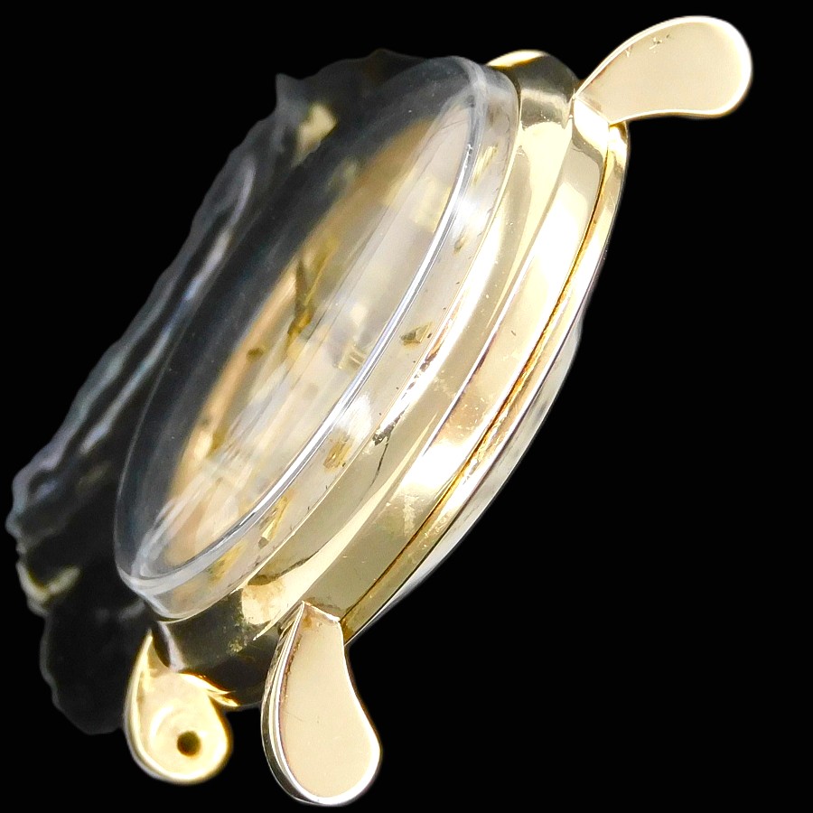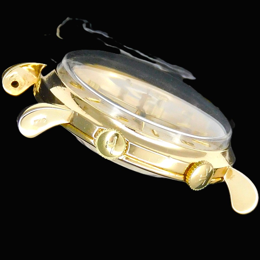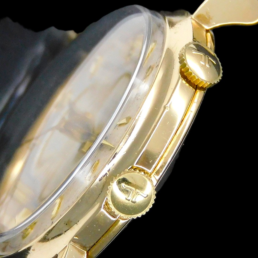 | 【商品説明】 2時位置の竜頭を巻く瞬間、アラームを鳴らすゼンマイにトルクがかかり、それまで機械内部から聞こえるカラカラという軽い金属音が鳴りやむ。そして2時位置の龍頭を引き,文字盤内部のアラーム時間をセットするディスクを回し、そのセットタイムに時間針ば到達したた瞬間に裏蓋にあるスティックを機械内のハンマーが叩き、勢いよく金属音が鳴り響く。その15秒という軌跡はジャガールクルトの原点と言っても過言ではない。 1956年、世界初自動巻きアラーム”Cal.815″の開発に伴い、特許申請した際、商品登録に至った”メモボックス”という名の偉大なる世界は、1948年にルクルトが初めてアラーム時計を開発したファーストキャリ”Cal.489″から2代目”Cal.814″までの1960年までそこに名づけられた”リストアラーム”の世界を原点とし、その発動により世界がアラーム開発の渦へと巻きこんでいく、世界初の腕時計アラーム開発ヴァルカン社の世界を打ち消し、ア・シールドというエボーシュの追い上げを諸共せず、メモボックスという永遠に語られることとなったこの特別な名は”リストアラーム”無くして語られることは無いだろう。当然、その”814キャリ”の存在は、ジュラ様式にとらわれない実用性と構造的リーズンから伴う2/3ブリッジの大胆な造形に言葉を失うほどの美しさを感じることができよう….. そんな今回の一品、10金無垢の強固でありながらも金無垢の輝きを放ち、ラグの形状にティアドロップの造形を施すことで、更に高貴な装いとして全体的を華やかに仕上げているが、そのストーリーはブリティッシュ市場に向けた一品で、1950年から1960年頃まで、ジャガー社にブリティッシュにおけるケースメーカとして供給したデ・トレヴァース社製“にレパードのロンドンインポートマーク。9.375のブリティッシュの9金無垢ホールマークに、1957年インポート年”b“のホールマークは、当然、当時、数少ないブリティッシュ仕様の一品は市場に出回ることのない最高の一品である。 ★★★ JAEGER LECOULTRE ★★★ 2’nd alarm hand-winding ” WRIST ALARM” 9K Solid Gold wtih Tea Drop Lug セカンド手巻きアラーム ”リストアラーム” 9金無垢 ティアドロップラグ ☆☆☆ 1955年前後製造ビンテージ ☆☆☆ (メンズ/平置日差;+15秒/振り角;265°/片振:0.2ms/拘束角;52°) ※タイムグラフ実測での数値ですが、環境により変化致しますので、あくまでも目安すとしてお考え下さい。 バンド、バックル以外完全純正オリジナル※ダイアルはリダン痕は全くございません。 ☆☆☆ 奇跡のオリジナルコンディション ☆☆☆ ダイアル裏の爪足の偽造痕のチェック、リダン痕のチェツク済み バンド、バックル以外完全オリジナル※ダイアルも含め完全オリジナルコンディション ★☆★ Cal.814 ★☆★ ALARM (アラーム) YEARS OF MANUFACTURE(製造期間):1949 RUNNING RESERVE(パワー時間):40時間 VIBRATION(振動数):18000/時 JEWEL NUMBER(受石数):17石 BREGUTE BALANCE WHEEL(ブレゲひげゼンマイ) 【刻印】JAEGER LECOULTRE FAB SUISSE P814 ☆ 1955年頃製造製造純正 シルバー文字盤 W/アプライド(立体的)アラビックナンバー飛び表示アワーマーカーズ ☆ 【刻印】:JAEGER LECULTRE SWISS MADE 【状態】:(当時のままの状態で経年のヤケが文字盤全体にで最高のビンテージコンデイション) ☆ 1955年頃製造純正 9金無垢ラウンドフロントケース ☆ 【サイズ】:32mm(リューズ含めず)×40mm(両ラグ先端まで) 【状態】:(当社では磨きはしてございませんが、目立つキズ、打痕などは一切ございません) ☆ 1955年頃製造純正 9金無垢スナップバックケース ☆ 【刻印】: 【状態】:(裏蓋の紋章、刻印ございますでご確認下さい。他、一切目立つキズ、打痕などはいっさいございません) ☆ 1955年頃製造純正 10金張り アラーム(2時位置)時間セット(4時位置)竜頭 ☆ 【状態】:(目立つキズ、打痕いっさいございません) ☆ 1980年代ビンテージ、エクステンション金張りブレス ☆ 【状態】:(目立つキズ、打痕一切ございません) |