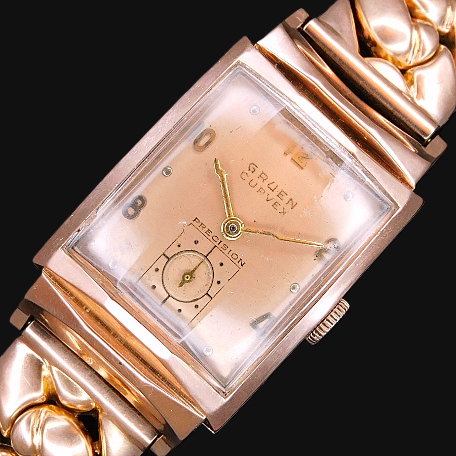 | 【商品説明】 その凄まじいほどの妖美な紅に染まるウエスト23mmに長き41mmの湾曲したボディーは、ジオメトリックな様相で、見た物すべての脳裏に刻まれ、忘れえないほどの威圧感が感じる。その14金無垢レッドゴールドと呼ばれし希少な存在、ピンクよりもローズよりも赤く染まり、パテック、ロレックス、ヴァシュロンであってもこの存在自体には及ぼないかもしれない。文字盤もサーモンピンクの純正文字盤、リダンの全くない最高の40年代からのこの一品のストーリーとグリュエンがいかに角型の名手と呼ばれるようになったかを理解した時、あなたはこの一品のとりこになるばずである。カーブドキャリバー440、18000振動17石の湾曲ボディーが、更なるこの一品の魂をかんじさせてくれける。 1920年頃からスイス、ビエンヌに工場を設立し、1925年キャリバー117の開発により角型のマニュファクチュールとしてアメリカを代表するブランドはスイスへとその軌跡と野望は広がり、角型での開発では一目置かれる存在となった。当然その技術は生かされ、1928年にその特許の申請の名に残されたように同じビエンヌの地でムーブメントを製作していたロッレクスとエグラーへの資本参加へとなり、グリュエンCal.877はロレックス プリンスキャリバー300の開発となったのは事実である。ドイツ人であるグリュエン創業者””が、同じくしてドイツで生まれ育った”ハンス・ウイルスドルフ”との謎たる因果関係があったのだろうかわからないが、その後グリュエンが突然1936年に資本参加を降りると同時に角型としての自社キャリを開発し世界にその度肝を抜くモデル発表したのも事実である。そんなグリュエンも1933年にロレックス、エグラーとの資本提携をやめ、その経験の中で誕生していったのが、言わずと知れたカーベックスであり、腕の曲線に合わせ、時計自体を湾曲させるどころか、ムーブメントまで湾曲させてしまった伝説”Cal.311”である。 それは更に腕にフィットするようにCal.330ファミリーのロングキャリへと変わり、1940年には、あらゆるケースデザインにフィットするようにクッションシェイプと呼ばれるカーベックスキャリバー”440ファミリー”が誕生した。 14k Solid “RED” gold curved Ruqurtangular - CURVEX – Curved movemnt style 14金無垢 カーブド(湾曲した)レクタンギュラーケース “カーベックス” カーブド(湾曲した)機械 R e f . 4 4 0 5 7 7 ☆☆☆ 1940年代製造アンティークコンディション ☆☆☆ (メンズ/平置日差;+60秒/振り角;255°/片振:1.0ms/拘束角;55°) ※タイムグラフ実測での数値ですが、環境により変化致しますので、あくまでも目安すとしてお考え下さい。 1940年代年頃製造.付属品無し ☆ 1940年製造純正 14金無垢レッドゴールド カーベックス(湾曲)ケース ☆ 【サイズ】:23mm(竜頭含めず/含め31mm)×41mm(ラグoラグ) 【状態】:(目立つキズ、打痕はございませんが小傷ございます。当社で磨きはしてございませんので、磨き希望の方はお気軽にお申しつけ下さい。) ☆ 1940年代製造純正 14金無垢レッドゴールド カーベックス(湾曲)スナップバックケース ☆ 【刻印】:CASED ITMED ID USA BY GRUEN WATCH CO WADS WORTH 14K L 440577 【状態】:(目立つキズ、打痕はございません。かなりいい状態で、バフがけは当社で行いましたが、ほぼ磨き痕のない最高の状態です) ☆ 1940年製造純正カーベックス(湾曲) サーモンピンクダイアル W/2.4.6.8.10 飛び表示アワーマーカーズ ☆ 【状態】:(全くのリダンのない1005純正で、文字盤もローズカラーの濃い純正色です) 【刻印】GRUEN CURVEX PRECISION ☆ 社外ビンテージ1980年代レッドゴールド(GF) エクステンションブレスレット(伸縮) ☆ 【状態】ほぼ未使用 ★☆★ Cal.440 ★☆★ BREGUET BALANCE SPRING(ブレゲヒゲぜんまい) SHOCK PROOF(耐震):NON INCABLOC(耐震機能無し) VIBRATION(振動数):18000/時 JEWEL NUMBER(受石数):17石 RUNNING RESERVE(パワーリザーブ):36時間 【刻印】:(SEVENTEEN 17 JEWELS GUREN WATCH CO CURVEX PATENTED SWISS MADE UNADJUSTED 440) |