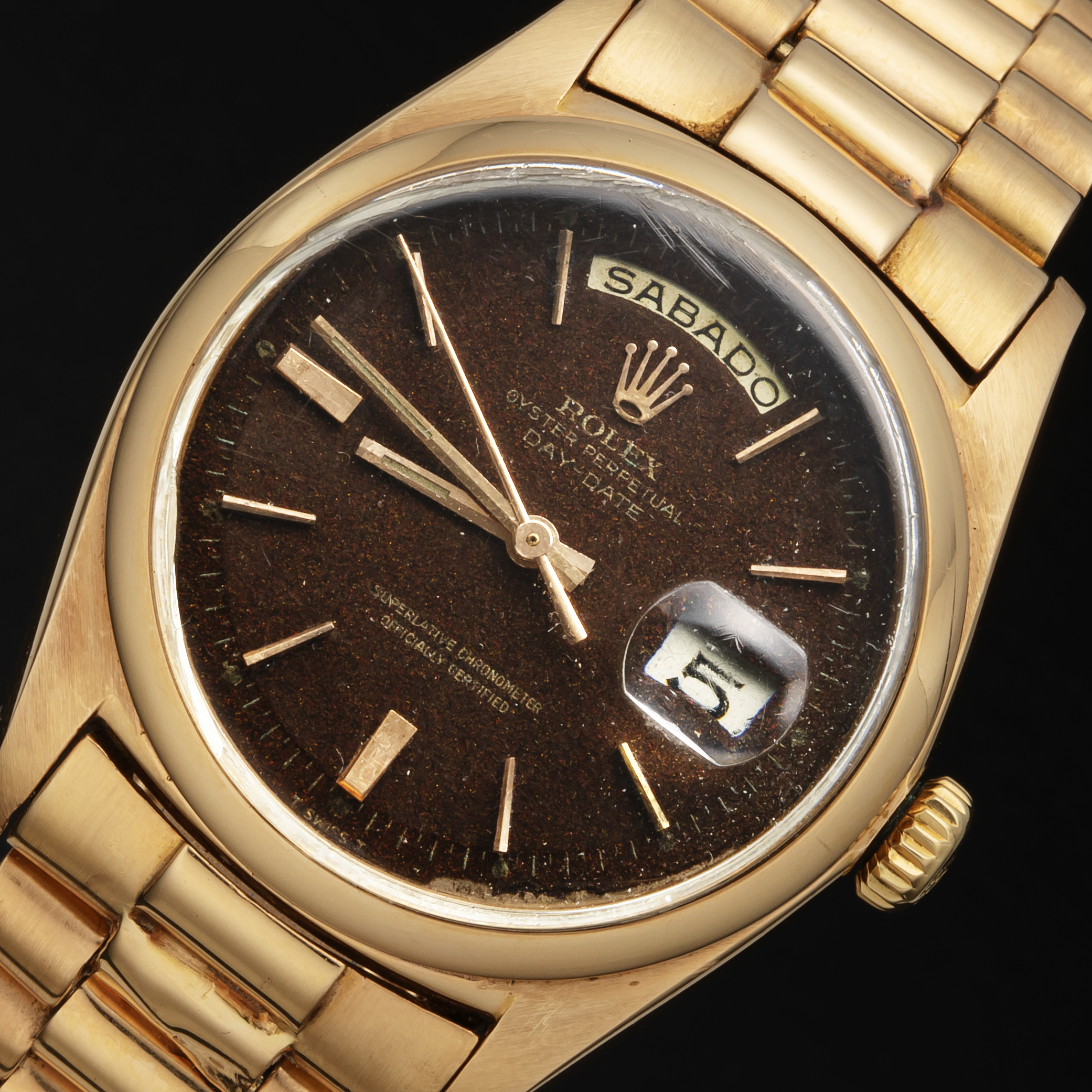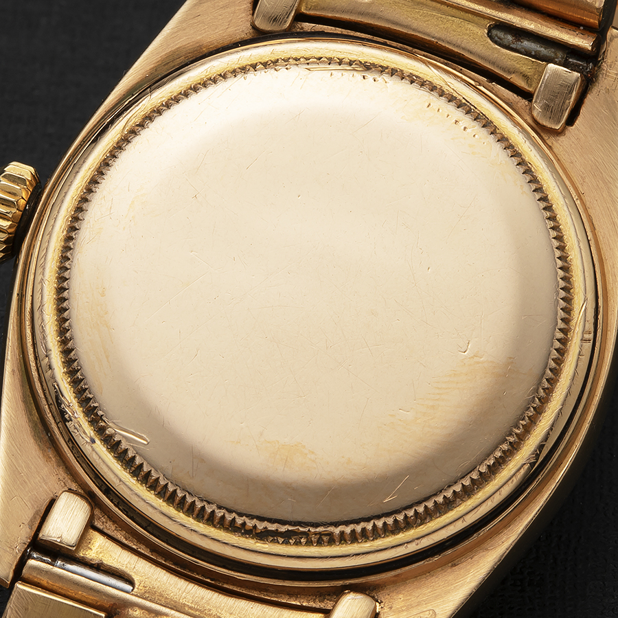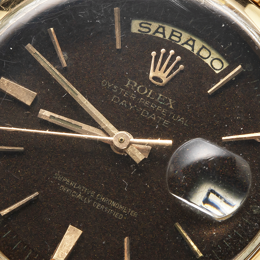 金無垢モデルのみの仕様として現在ロレックスモデルの中では異質的存在となるが、6500,6511のファースト誕生の1954年の誕生ではスティールモデルとしも存在し、6611へと引き継がれた。完全金無垢モデルのみとなったRef.1803は言わば、メタリアルに拘ったラグジュアリー最高機種としてロレックス史の中でも違った意味を成していたのかもしりない。当然現在でもプレジデントいう名はロレックスの中でも最上級モデルして存在し続けていることは確かである。当然、そのメタリアルへの拘りは、この一品が示すように18金無垢ながら赤みの強い色合いとなっている様相を見て頂ければ一目瞭然である。当然、銅を含むが基本的に金を750とした場合、当時の583である14期無垢で理解できるように基本200を有すると言われる中、250の中で銅の割合をどくのくらいにするかで決まってくる。この時代の他デイトジャストを含み、ピンクゴールドが市場に出回る確率は相当に低い。それも今回の一品はベゼルがスムースとなる”リフアレンス1802”である。バックケースナンバーは共有パーツ1803、しかし6時位置ラグ刻印は”1802”。出会えることさえ奇跡的なことであるので出会った瞬間は感動である。現在、世界的市場にも全くでない存在である。当然ブレスも当然、スイス製の18金無垢のピンクゴールドのビンテージたる証をスモールの飛びだしロゴが語るようにプレジデントブレスとしてはなかなか希少である。当然のことながら、3針全てピンクゴールド。そして見るだけでその魅惑の世界に引き込むかのようなブラウンのダイアルは、コレクターかは幻と言われる経年のヤケ、すべての環境が作用することで、その色合いを見出したトロピカルダイアルの存在が確固たるこの一品の存在価値を限界へと導いたと言えよう。