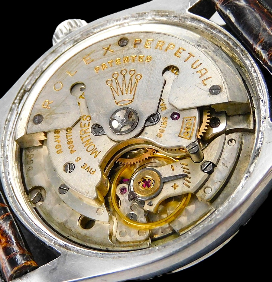 1932年より自動巻きという新たな進化を遂げたタイムピースの世界、ロレックスによりその世界は確立され、1940年に入りその自動巻というムーブメントにサイズナンバーが刻印されることとなるそれは620NAから始まり、630NAへのバブルバック最終キャリへ、そして1950年にはサイズ”A260”/645キャリバー、そして”A296/745キャリバー”というセミバブルバックへと進化を遂げた。しかしその同年ではそれまでの左方向への巻き上げでしかゼンマイが巻き上がらないいわゆる”片巻きあげ式”から両方向から巻き上げるこの出来る”両方向巻き上げ”が開発された。その後のロレックスの基本系と言っても過言ではない”Cal.1030”が登場となる。なぜ1030がありながらセミバブルバックと呼ばれる”645,745キャリバーが55年頃まで存続したかは定かではないが、そのダストケースの下に隠れた645,745の仕上げは基本8姿勢差にスワンネック緩急針と高度な技術を使っていることもあり、ロレックス自体が直ぐに、特に今までの天輪にリム部分を設け、抵抗力を無くしたスーパーバランスからチラネジを有する”1030キャリ”だけにロレックスの確信を得ることは出来なかったのかもしれない。