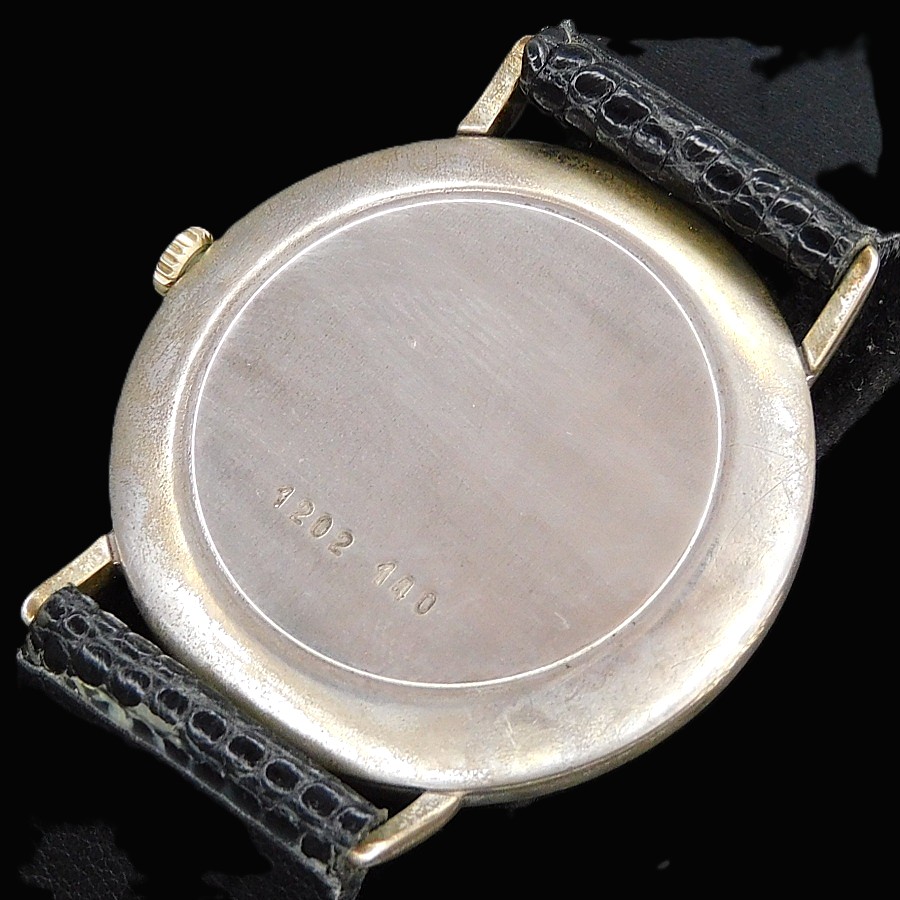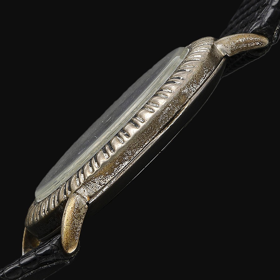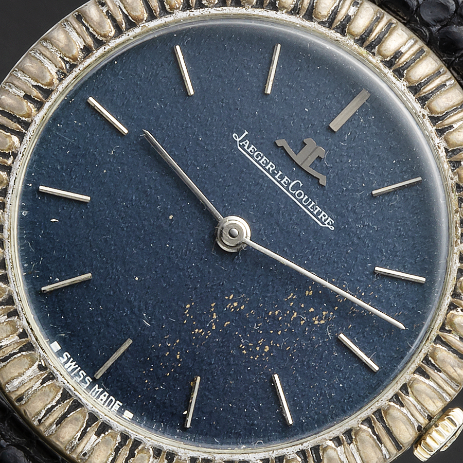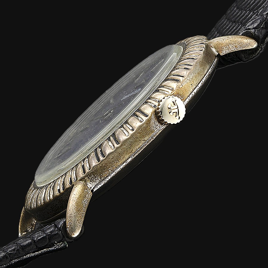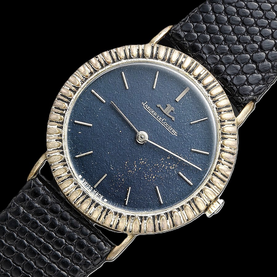 | 【商品説明】 紀元前3000年頃から人々に愛され続け、その輝きに魅了され9世紀頃からそれぞれの文化により銀精製技術が異なる発展を継げていった….. 元素記号は『AG』…ラテン語で白い輝きを持っという語源を持ち、その言葉の如しその輝きはこの世の万物たる中では匹敵するものはなく、可視光線に対する反射率98%は、プラチナの輝きをも超える存在となる。しかしそれはもうひとつの顔として、硫黄により化学変化を起こしやすい特徴を持ち、磨けば磨くほど、この世で一番輝く存在となるが、一旦空気中の硫黄に触れた途端、それは茶褐色となり、そして黒ずんだ深い味わいへと変化していく。その様はまるで人間の心のなかの変化のようにその環境、時々の変化で変わっていく…. そして今、ここに銀という素材をここまで活かした逸品に出会えたことに感謝したいと感じる逸品がここに存在する。 JAEGER LECOULTRE…ジャガールクルト Ref.9033…… 銀無垢というメタリアルをジオメトリックな造形美をベゼルに表現し、幾何学的な様相と銀無垢がおりなす白銀の輝きとその輝きを浸透させるかのような透明感のある漆黒の神秘的様相を醸し出す。機械は1959年に開発し、2針の象徴として偉大なるキャリバー818キャリバーの存在である。1992年に28800の高振動化へとバージョンアップしながらも30年以上の時をルクルトを支え続けてはた偉大なるキャリバーである。 ※銀無垢ケースでございますので、黒くすすみたいになっておりますが、銀無垢独特の白く輝かせることは出来ますので、こ希望の方はさせて頂きますので、お気軽にお申しつけ下さいませ。 ★★★ JAEGER LECOULTRE ★★★ 800 Solid Silver “Round” Engraving Giometric Finished Bezel 800 銀無垢シルバー “ラウンド” ジオメトリック幾何学的彫金ベゼル R e f . 9 0 3 3 ☆☆☆ 1960-70年頃製造ビンテージ ☆☆☆ (メンズ/平置日差;+15-40秒/振り角;255°/片振:0.5ms/拘束角;52°) ※タイムグラフ実測での数値ですが、環境により変化致しますので、あくまでも目安すとしてお考え下さい。 バンド、バックル以外完全純正オリジナル※ダイアルはリダン痕は全くございません。 ☆☆☆ 奇跡のオリジナルコンディション ☆☆☆ ダイアル裏の爪足の偽造痕のチェック、リダン痕のチェツク済み バンド、バックル以外完全オリジナル※ダイアルも含め完全オリジナルコンディション ★☆★ Cal.818 ★☆★ GNEVE SEAL STANDARD(ジュネーブシール 合格規格) COTE DE GENEVE(コートドジュネーブ) YEARS OF MANUFACTURE(製造年):1959年 RUNNING RESERVE(パワー時間):38時間 VIBRATION(振動数):18000/時 JEWEL NUMBER(受石数):17石 BREGUTE BALANCE WHEEL(ブレゲひげゼンマイ) 【刻印】LECOULTRE & CO UNADJUSTED 17 JEWELS SWISS MADE 818/2 ☆ 1960-70年頃製造製造純正 ブルー文字盤 ☆ 【刻印】:JAEGER LECOULTRE 【状態】:(当時のままの状態で経年のヤケが文字盤全体にで最高のビンテージコンデイション) ☆ 1960-70年頃製造純正 800銀無垢ラウンドケース ☆ 【サイズ】:34mm(リューズ含めず)×39mm(両ラグ先端まで) 【状態】:(当社では磨きはしてございませんが、目立つキズ、打痕などは一切ございません) ☆ 1960-70年頃製造純正 800銀無垢スナップバックケース ☆ 【刻印】: LECOUTRE CO PHC 0.800 9033/ 1202 110 【状態】:(細かキズ、打痕ございますが、目立つものではございません。) ☆ 社外クロコダイル本革ストラップ & 社外 尾錠 ☆ 【状態】:(ビンテージの漂いが素晴らしい) |