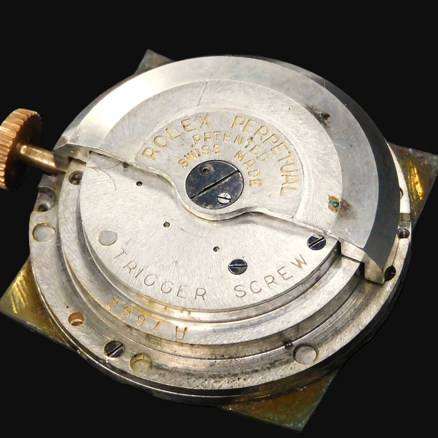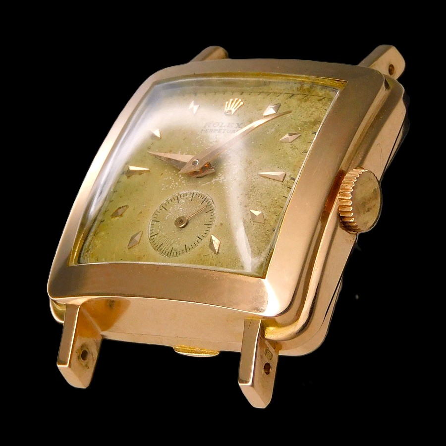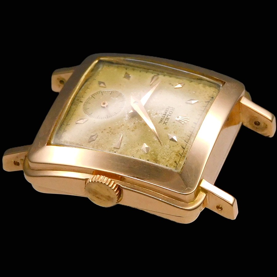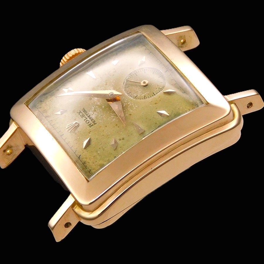 | 【商品説明】 特許ナンバー144350。1929年、ロレックス初の自動巻きとして初めて出願された。この機構により世界は大きく変わることとる。そして世界が震撼することとなるパーペチュアルのオートローターに関する最初の特許ナンバーが160492で、エグラー社のエミール・ボレが発明したことでも有名である。特に特許ナンバー170803の1933年の出願では、バブルバックと言われる神髄となるローター開発の基盤となるどの方向に回転しても2つの整流する歯車を通し、その歯車の中に逆回転させないようにそれぞれに歯車を設置とている。そのローターは甲箱に取り付けられたそれぞれにコハゼを配備した2つ歯車がローターの動力をバックラッシュさせないように、ゼンマイに伝える為に3本のアームを曲げたディスクパーツなどを組みこむことで、機械の動力部位の上に高さを要した自動巻き機構がはめこまれることで、必然的に裏蓋を膨らませる必要があった。それがバブルバックの根源である。 そんなハブルバックは1933年にファーストモデルが発表されているが、最初にそのローター部位から分解する為に初めての経験となる技術者り為に、ローターの下にふるカバー面に分解する時のネジ部位の説明を簡易に刻まれたが、セカンドモデルでは、その説明書きが無くなっている。そしてサードモデルでは後、620のキャリバーナンバーが与えられることとなるサイズNAが初めて投入される。そして、他ブランドも主力キャリバーをサイズダウンすることにより多様なモデルに搭載できるようにしたキャリバーを存在させるが、ロレックスも620をサイズダウンさせたサイズAR、キャリナンバーは520と称されたミドルキャリが1936年に誕生した。同年にはレデイースの主力キャリとなるセンターセコンド530ARが誕生していく。 今回のモデルは多様的な角型として希少なモデルで1946年から1952年までの6年間という短い期間にだけ存在した。 Ref,.4643 18金無垢ローズゴールドでかなり紅ボティーの輝きは見事であり、28MMボディーとしてラウンドとしては34MMサイズと同等の大きさであることで、かなりその存在感を感じる当然パーペチュアルであることで、2段の切換え者車を要することで、裏蓋を膨らませなければ機械が裏蓋に当たってしまうプロセスがバブルバックだが、この4643はバブルバックではないが、スクエアー型に膨らみを持たせるいわゆるバージングケースであり、バブルバックと呼ぶ方がいるが、バブルバックの根源は泡のような膨らみ、防水、パーペチュアル(自動巻き)である3点の意味であり、ロレックス自体もADでしっかりと謳っている。言わば完全に別ものである。ではこの4643の真実の根源たる意味は、やはり520ARの存在意味であろう。ロレックスは創業当初から機械製造数と時計個体自体の数の違いにより年代の違う古い機械を新しいモデルに搭載し、在庫整理を行う現代の企業のお手本的システムを組み込んでいたことは事実であり、この機械も1936年製造しながら、1946年に使用するということ自体、ロッレクスという企業の本質、そしてファミリー企業であることで、繊細な企業努力を形のするサクセスストーリーの根源を理解出来よう。 18k Solid Rose Gold ”SQUARE BULGING BACK” !8k Rose Diamond-shaped Hour-makers 18金無垢 ローズゴールド “スクエアー バルジング バック” 18金無垢ローズゴールド ダイヤモンド型 インデックス R e f . 4 6 4 3 ☆☆☆ 1950年頃ビンテージコンディション ☆☆☆ (メンズ/日差;+20-30秒/振り角;235-255/片振り:0.5/拘束角:55°※テンプ、アンクル洗浄、注油、緩急針にて調整済) ※タイムグラフ実測での数値ですが、環境により変化致しますので、あくまでも目安すとしてお考え下さい。 ☆☆☆ 奇跡のオールオリジナルコンディション ☆☆☆ 付属品:無し 文字盤の裏もリダン痕、レッグの偽造痕もチェックさせて頂いております ☆ 1950年頃製造 純正18金無垢ローズゴールド ロレックスエンブレム シルバー文字盤 ☆ 【刻印】:ROLEX PERPETUAL SWISS MADE 【状態】:文字盤全体に緑青が出ておりますが、ビンテージとしての風合いが感じられて、当時のままのオリジナルコンディション ☆ 1950年頃製造 純正ローズゴールド ダイヤモンド型 インデックス & アルファー針 【状態】:変色もなく、一見してもローズゴールドとかわるほどの紅の奥深い色合いです。 ☆ 1950頃製造 純正18金張りローズゴールド”OYSTER PATENT” トップ竜頭 ☆ 【状態】:(剥がれや損傷個所はいっさいございません) ☆ 1950頃製造 18金無垢ローズゴーールド スクエアー型 ミドルケース ☆ 【状態】:(ほぼノンポリッシュだが、目立つキズ、打痕ございません。当社も一切研きもしてございません) 【サイズ】:28mm/横径リューズ含めず(含みmm)×37mm/両ラグ先端まで ☆ 1950年頃製造 18金無垢 バルジングバックケース(独特の膨らんだケース) ☆ 【刻印】: ROLEX GENEVA SWISS PATENTED 0.750 18K 4643 【状態】:(当社で磨きはしてございませんが、目立つキズ、打痕もなく、ノンポリッ