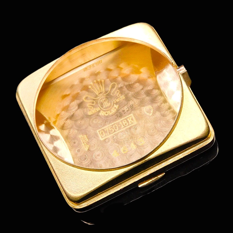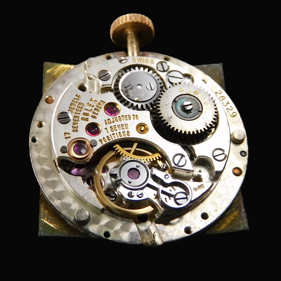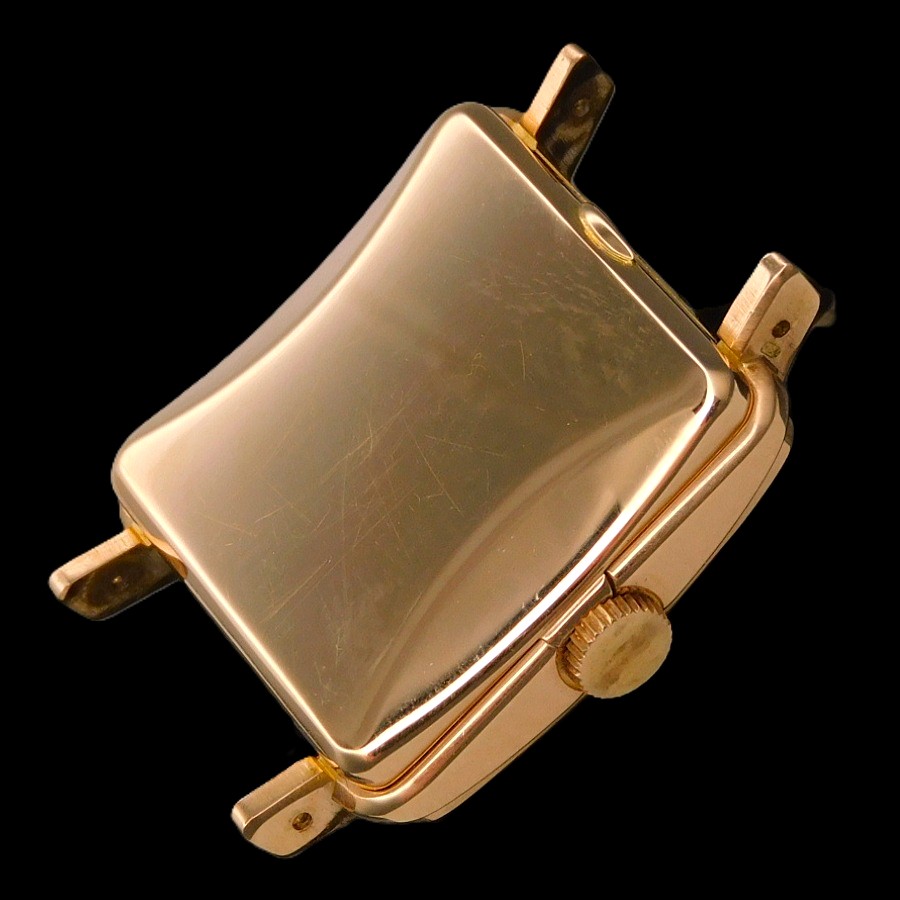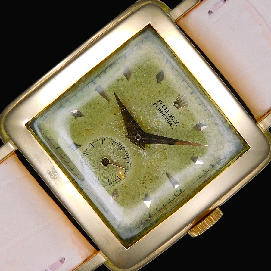 | 【商品説明】 特許ナンバー144350。1929年、ロレックス初の自動巻きとして初めて出願された。この機構により世界は大きく変わることとる。そして世界が震撼することとなるパーペチュアルのオートローターに関する最初の特許ナンバーが160492で、エグラー社のエミール・ボレが発明したことでも有名である。特に特許ナンバー170803の1933年の出願では、バブルバックと言われる神髄となるローター開発の基盤となるどの方向に回転しても2つの整流する歯車を通し、その歯車の中に逆回転させないようにそれぞれに歯車を設置とている。そのローターは甲箱に取り付けられたそれぞれにコハゼを配備した2つ歯車がローターの動力をバックラッシュさせないように、ゼンマイに伝える為に3本のアームを曲げたディスクパーツなどを組みこむことで、機械の動力部位の上に高さを要した自動巻き機構がはめこまれることで、必然的に裏蓋を膨らませる必要があった。それがバブルバックの根源である。 そんなハブルバックは1933年にファーストモデルが発表されているが、最初にそのローター部位から分解する為に初めての経験となる技術者り為に、ローターの下にふるカバー面に分解する時のネジ部位の説明を簡易に刻まれたが、セカンドモデルでは、その説明書きが無くなっている。そしてサードモデルでは後、620のキャリバーナンバーが与えられることとなるサイズNAが初めて投入される。そして、他ブランドも主力キャリバーをサイズダウンすることにより多様なモデルに搭載できるようにしたキャリバーを存在させるが、ロレックスも620をサイズダウンさせたサイズAR、キャリナンバーは520と称されたミドルキャリが1936年に誕生した。同年にはレデイースの主力キャリとなるセンターセコンド530ARが誕生していく。 今回のモデルは多様的な角型として希少なモデルで1946年から1952年までの6年間という短い期間にだけ存在した。 Ref,.4643 18金無垢ローズゴールドでかなり紅ボティーの輝きは見事であり、28MMボディーとしてラウンドとしては34MMサイズと同等の大きさであることで、かなりその存在感を感じる当然パーペチュアルであることで、2段の切換え者車を要することで、裏蓋を膨らませなければ機械が裏蓋に当たってしまうプロセスがバブルバックだが、この4643はバブルバックではないが、スクエアー型に膨らみを持たせるいわゆるバージングケースであり、バブルバックと呼ぶ方がいるが、バブルバックの根源は泡のような膨らみ、防水、パーペチュアル(自動巻き)である3点の意味であり、ロレックス自体もADでしっかりと謳っている。言わば完全に別ものである。ではこの4643の真実の根源たる意味は、やはり520ARの存在意味であろう。ロレックスは創業当初から機械製造数と時計個体自体の数の違いにより年代の違う古い機械を新しいモデルに搭載し、在庫整理を行う現代の企業のお手本的システムを組み込んでいたことは事実であり、この機械も1936年製造しながら、1946年に使用するということ自体、ロッレクスという企業の本質、そしてファミリー企業であることで、繊細な企業努力を形のするサクセスストーリーの根源を理解出来よう。 18k Solid Rose Gold ”SQUARE BULGING BACK” !8k Rose Diamond-shaped Hour-makers 18金無垢 ローズゴールド “スクエアー バルジング バック” 18金無垢ローズゴールド ダイヤモンド型 インデックス R e f . 4 6 4 3 ☆☆☆ 1950年頃ビンテージコンディション ☆☆☆ (メンズ/日差;+20-30秒/振り角;235-255/片振り:0.5/拘束角:55°※テンプ、アンクル洗浄、注油、緩急針にて調整済) ※タイムグラフ実測での数値ですが、環境により変化致しますので、あくまでも目安すとしてお考え下さい。 ☆☆☆ 奇跡のオールオリジナルコンディション ☆☆☆ 付属品:無し 文字盤の裏もリダン痕、レッグの偽造痕もチェックさせて頂いております ☆ 1950年頃製造 純正18金無垢ローズゴールド ロレックスエンブレム シルバー文字盤 ☆ 【刻印】:ROLEX PERPETUAL SWISS MADE 【状態】:文字盤全体に緑青が出ておりますが、ビンテージとしての風合いが感じられて、当時のままのオリジナルコンディション ☆ 1950年頃製造 純正ローズゴールド ダイヤモンド型 インデックス & アルファー針 【状態】:変色もなく、一見してもローズゴールドとかわるほどの紅の奥深い色合いです。 ☆ 1950頃製造 純正18金張りローズゴールド”OYSTER PATENT” トップ竜頭 ☆ 【状態】:(剥がれや損傷個所はいっさいございません) ☆ 1950頃製造 18金無垢ローズゴーールド スクエアー型 ミドルケース ☆ 【状態】:(ほぼノンポリッシュだが、目立つキズ、打痕ございません。当社も一切研きもしてございません) 【サイズ】:28mm/横径リューズ含めず(含みmm)×37mm/両ラグ先端まで ☆ 1950年頃製造 18金無垢 バルジングバックケース(独特の膨らんだケース) ☆ 【刻印】: ROLEX GENEVA SWISS PATENTED 0.750 18K 4643 【状態】:(当社で磨きはしてございませんが、目立つキズ、打痕もなく、ノンポリッ
