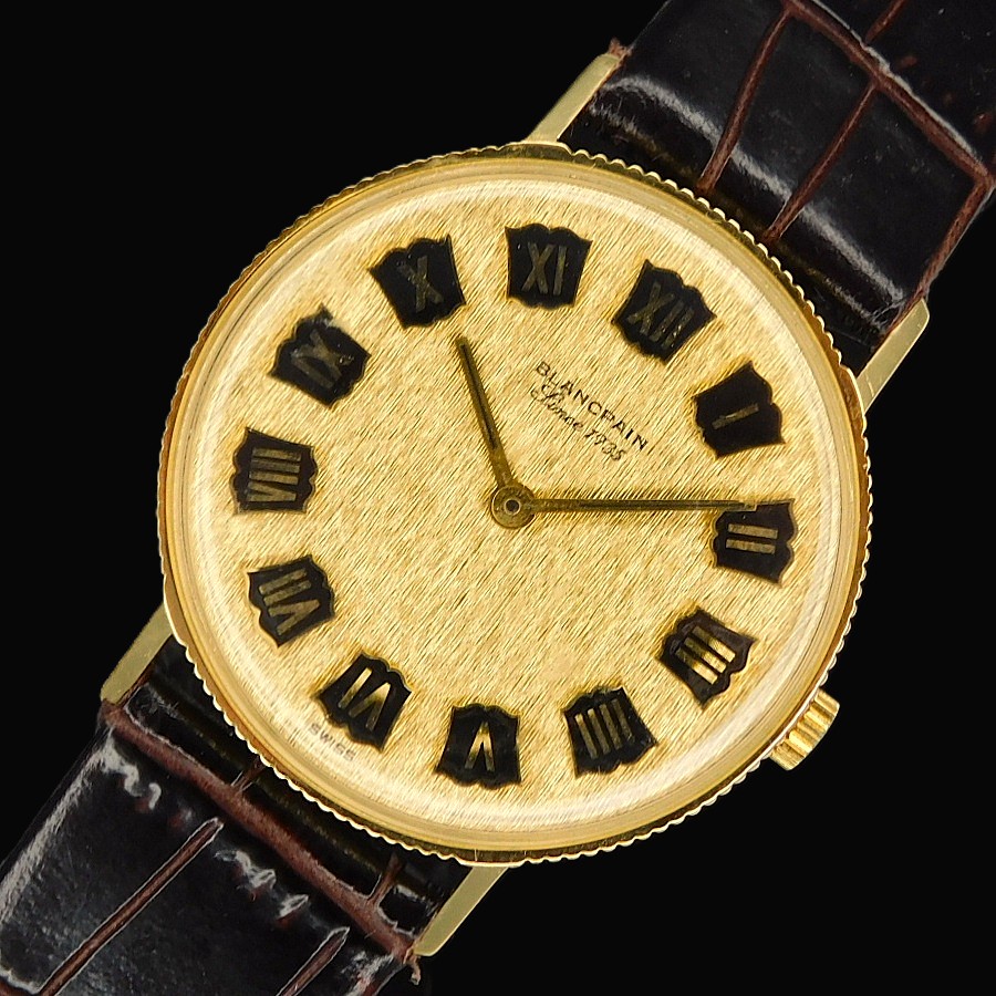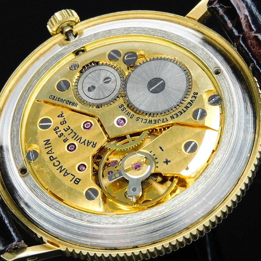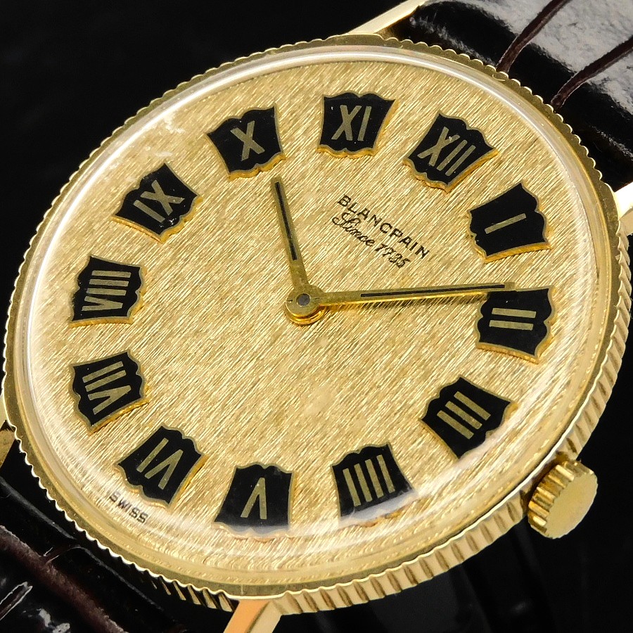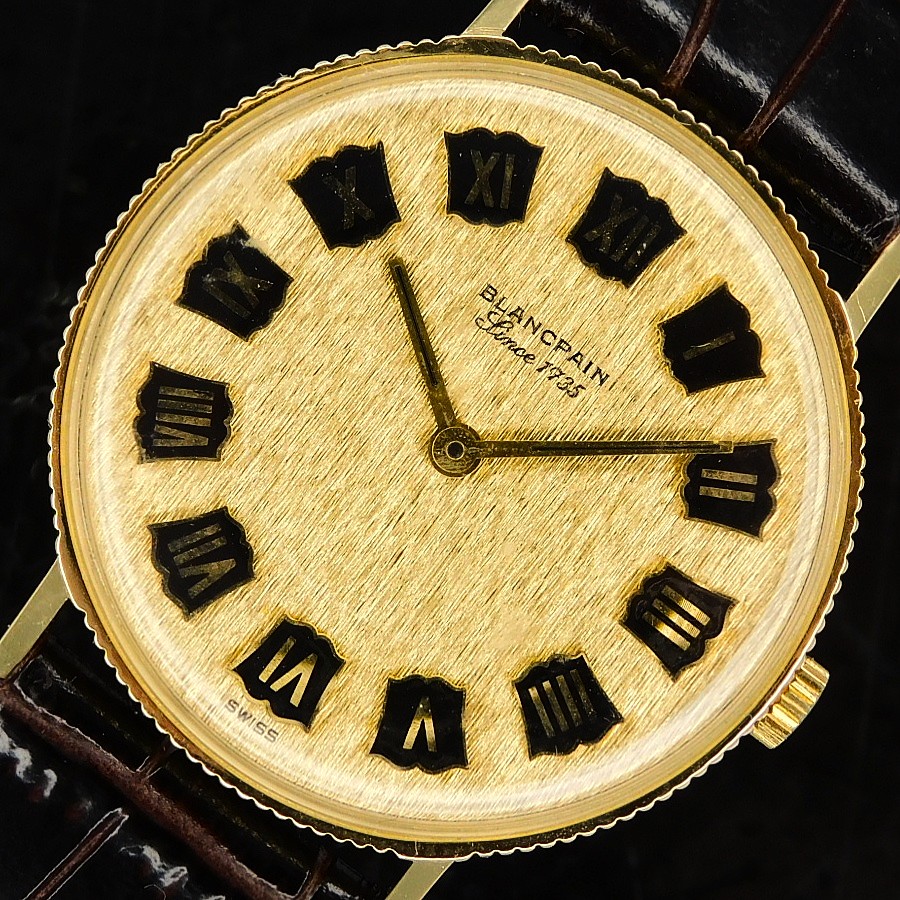 幻の逸品!18金無垢コインエッジケース立体的ローマンインデックス彫金文字盤★プランパン ゴールドスリム★伝説Cal.R575プゾー7001ベース