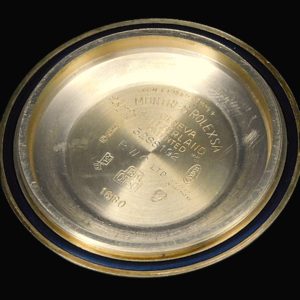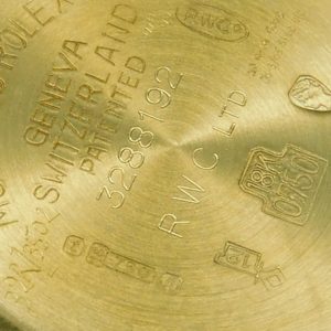 1974年にロンドンの港で輸入されたことを意味するtのロゴ。18金無垢としてブリティッシュで登録されたスクエアー型の中にΩを表記した18金無垢ホールマーク。1975年までブリティッシュで登録されたことを意味する750の数字とその左側に横になった18の数字を表記した18金無垢ロゴ。そしてスイスの農婦の顔をモチーフにしたスイスで製造されたことを意味する18金無垢ホールマークに18Kと0.750を上下に配した18金無垢ロゴ。全て裏蓋という世界にその意味たる根源がメッセージとして深く刻まれている。それはこの一品がスイスから直接、ロンドンの港に輸出された証であり、そのマーカーズメーカーとしたのがRWC Ltdの刻印が語るようにロレックスのイギリス支社が直接輸入したこととなる。当然それは特別な個体としてある意味を持ち輸入され、その証は裏蓋のセンター位置にシリアルナンバーが刻まれていることでそのストーリーは完結する。