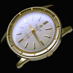 1942年CARL FRIENDRICH MEYER/フリードリヒ・マイヤーにより、ロレックスとは違う自動巻きシステムが開発され、1947年に、それまで主流であった片方からの巻き上げの自動巻きシステムを両方向から巻き上げることを可能としたバイ-ディレクショナル自動巻きを開発し特許を取得した。ロレックスの両方向巻き上げ1030が1950年であることで、実質的に世界で初めて開発したこととなる。そしてその後、その機械に与えられた名が伝説”Bidynator/ビ(バイ)ディネーター”である 1918年に創立された時計の機械製造会社として誕生したフェルサ。その歴史も偉大なるマイヤーにより世界にその名を馳せたと言ってもん過言ではない。フェルサはア・シールド社の一角としてエボーシュSAの主力自動巻きの基礎を作ってきたことは言うまでもない。そんなストーリーの中でご紹介する1品は、その中でも1950年頃から製造され、1560シリーズのベースともなったキャリバー1560搭載のブライトリングの希少な逸品。そのビディネーター独特のローターを外す場所の矢印までも刻まれたように、L字型に留められたクリック部位は44時間というパワーリザーブを誇る威厳を感じることが出来よう。その伝説たる機械のオーラを包みこむように、手にしたただけでその総重量48グラムの重量感を感じる35mの18金無垢ケースは12時間のスケールを厚手のベゼルに刻み男らしい表情で強く高貴な存在価値を見た物に与えてくれる。ほぼノンポリッシュ、使用痕の少ない完璧なその様相に見た者全てを酔い潰させるほどのオーラをこの一品から感じることが出来よう。 |
