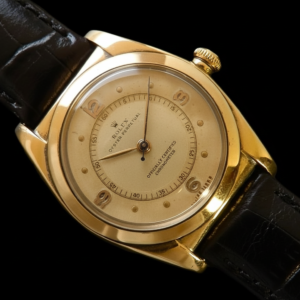 そして今回の一品はバブルバックRef.3131だが、9金無垢という希少な逸品である。特に文字盤はダイアルのセンター部分にステップのついた立体的なインダイアルを配し、そのインダイアル自体に細かい秒単位のスケールを描き、当然そのスケールを指す秒針でさえもポイントに合ったこのモデルの純正の秒針である。更にそのインダイアルの外周にも立体的なアプライドのアワーズを配し3,6,9の飛び表示にドットのインデックスを施し、それも時、分針も含め当時の純正のパーツとして完全体の状態でここに存在することをお伝えしたい。ドームから見る斜めから見るそのダイアルの立体感はこの一品を持ったものだけが味わえるステイタスであることは間違いない。