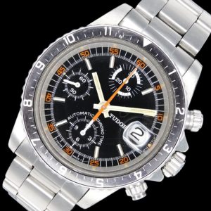 1970年、ロレックスデイトナのリスペクトした形で誕生したチュードルのクロノグラフの世界。バルジュー社”7734キャリ”を搭載したチュードルとして最初のクロノグラフモデル”7031/0,7032/0誕生し、1972年、バルジュー社”Cal.234″を向えデイトナ6263スタイルの”Ref.7149″、6265スタイルの”Ref.7159、そしてステンの回転ベゼルを備えた”Ref.7169″のセカンドへと移行された。その後、1976年バルジュー社からオートマティックが”7750キャリ”が発動すると、12時間積算計を搭載し、そこに初めてダイアルに”CHRONO TIME”というペットネームを刻み、ベイクライト製ベゼル/Ref.9420、回転ベゼル/Ref.9421、ノン回転ベゼル/Ref.9430、そしてバルジューらが”ETA社とかわりエボーシュ社とし新たな歴史を刻む”Cal.7750″のクロノタイム創世期最後のモデルとなるRef.94200,94210,94300がこの世に誕生することとなった。